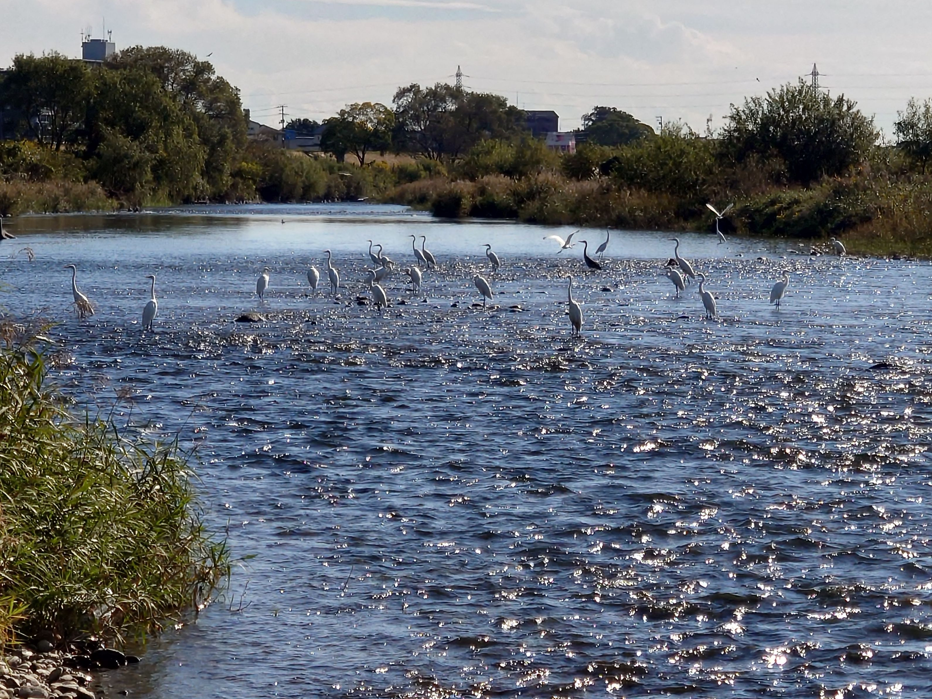 鮭の遡上が少ないので、鮭の卵は諦めて落ち鮎を狙うサギ達です 穏やかな秋の風景