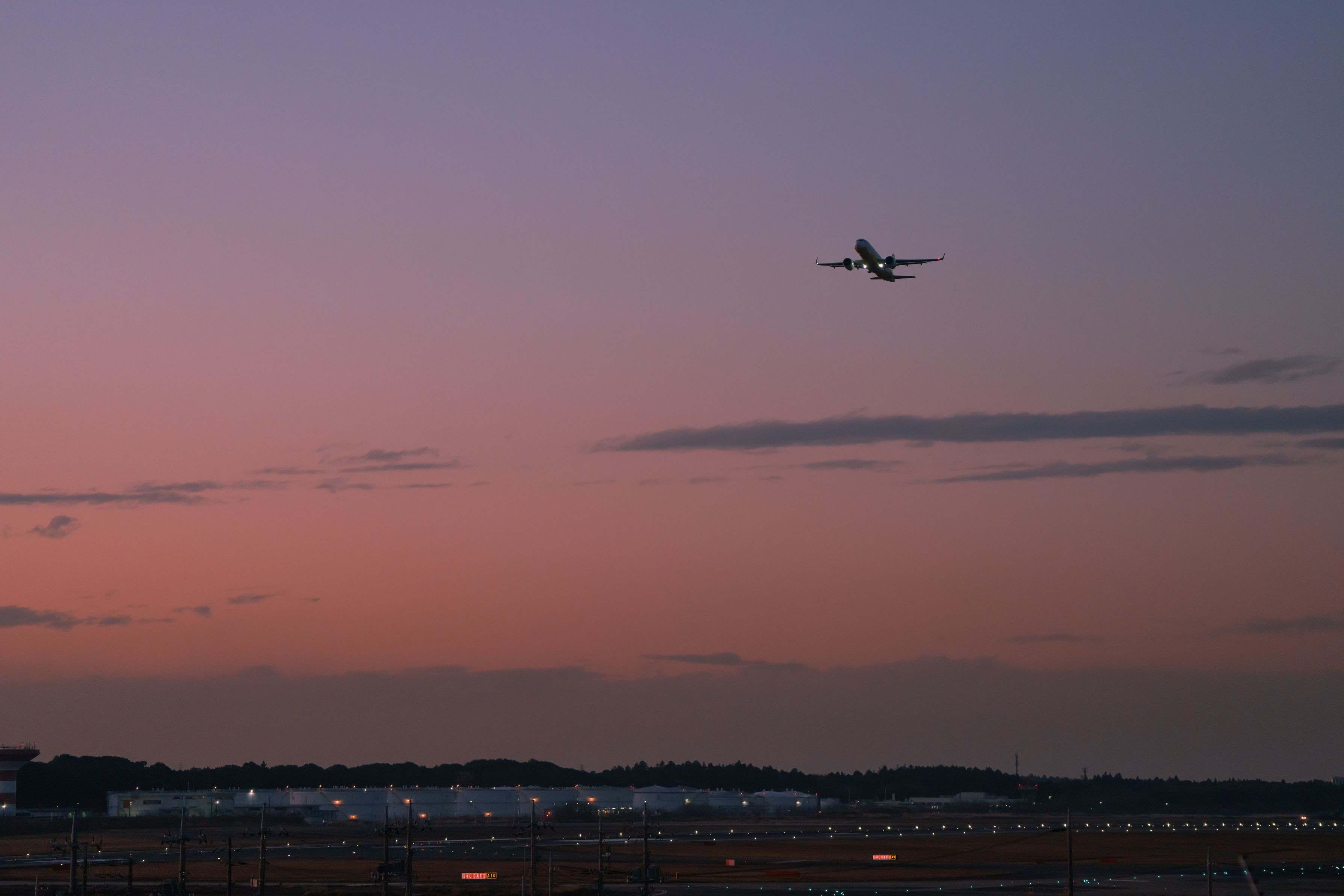成田空港の近くからマジックアワーの離陸機を撮影しました。