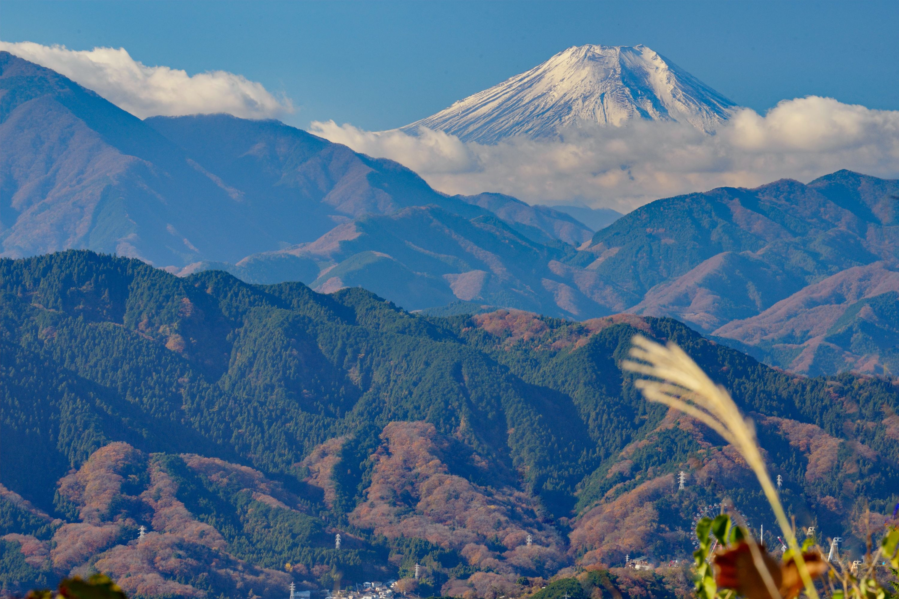 高尾山のもみじ平(もみじだいら)で撮影した富士山です。 晩秋らしく手前にススキを入れました。