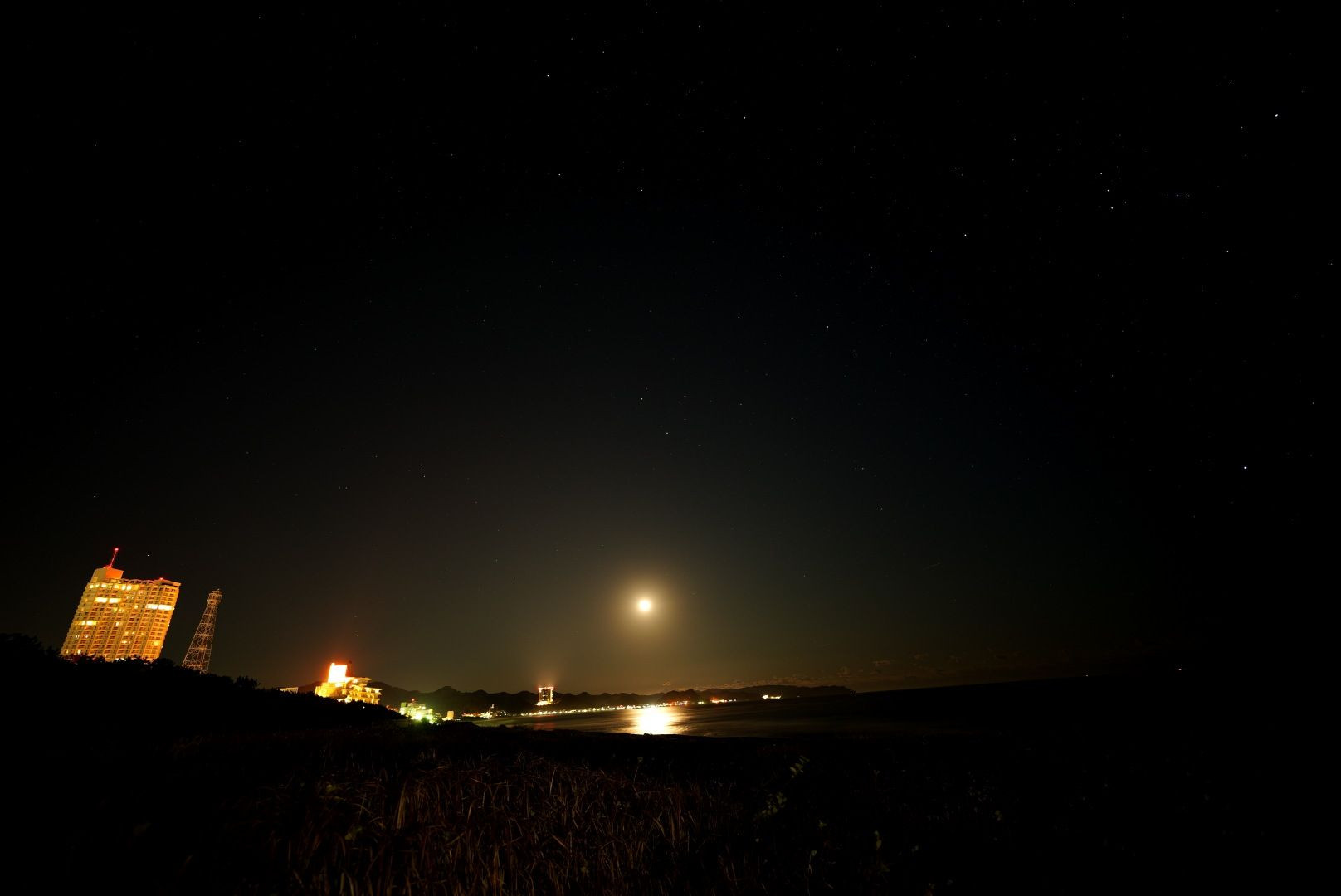 鴨川にキャンプに行った際に撮影。明るいため星はあまりきれいに撮れなかったですが、こんな感じの月の道が撮れました