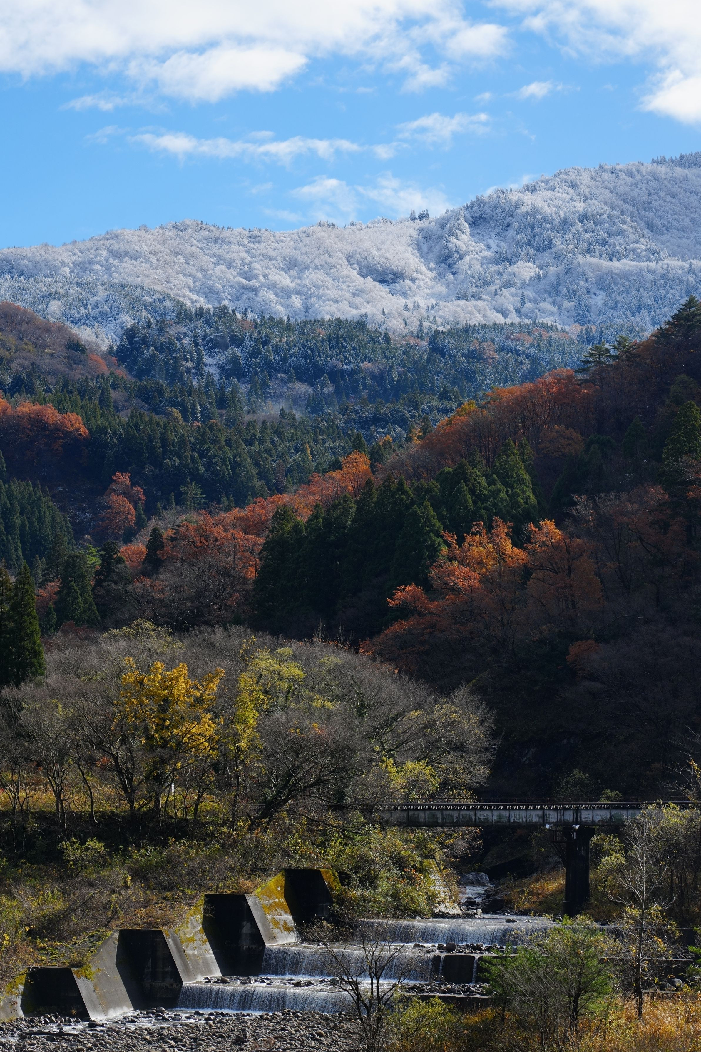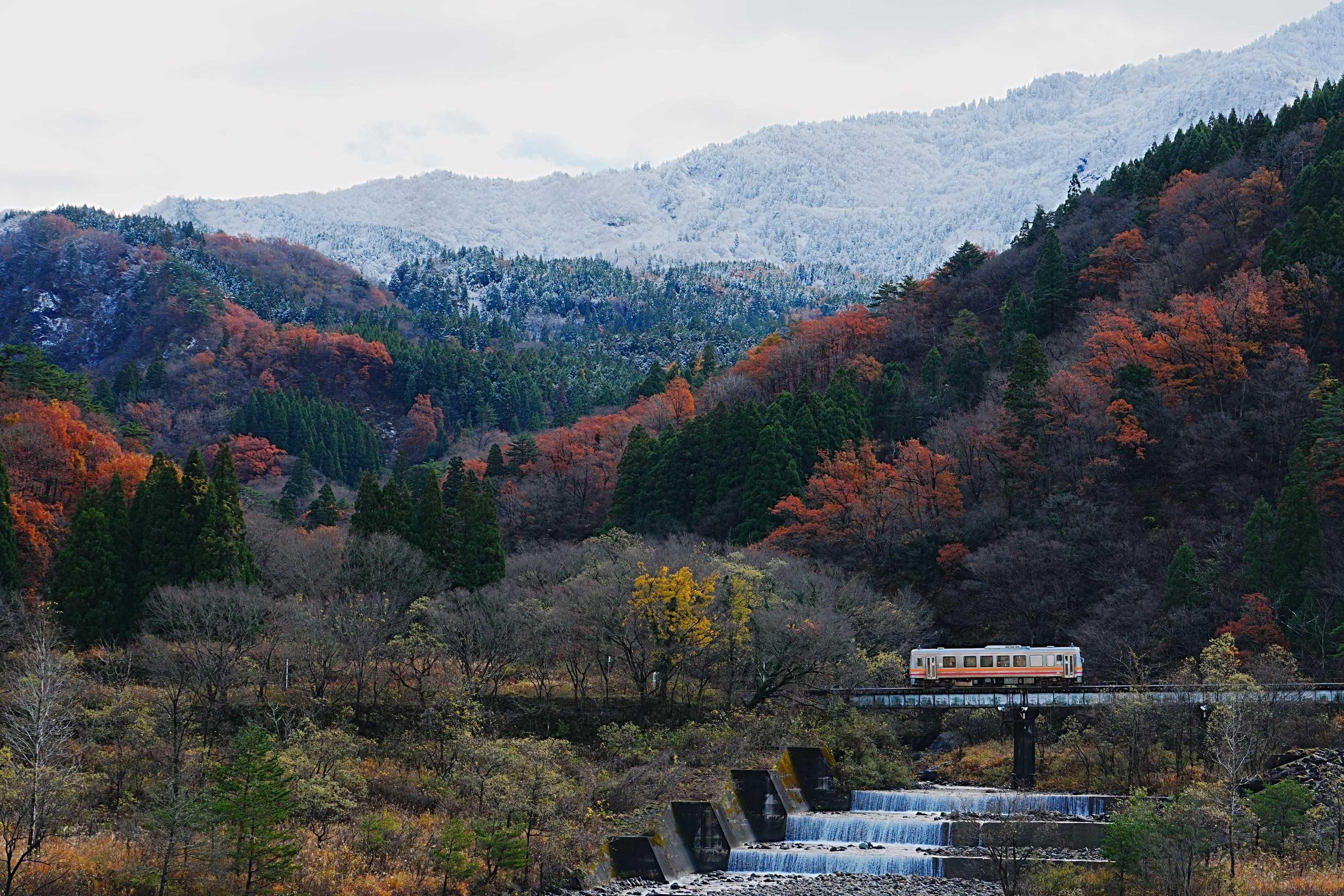 紅葉も終わるころ、山の頂には雪が舞い始めました。 初冬ならではの美しい風景を切り取りました。