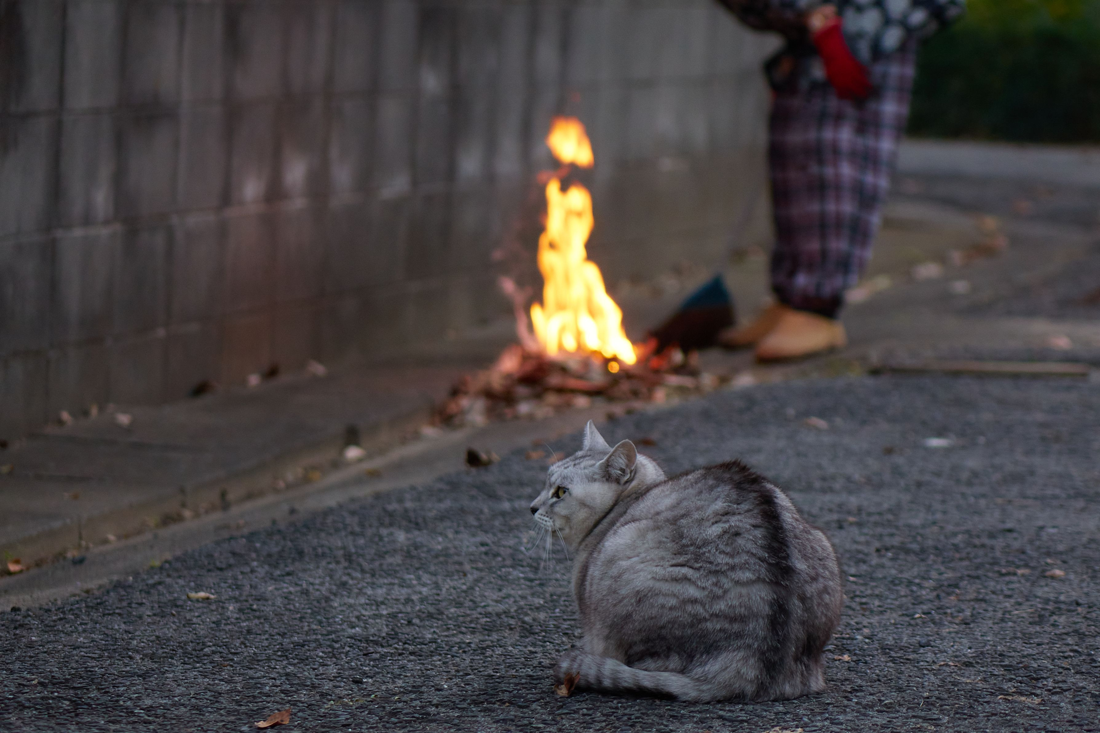 お母さんが落ち葉を集めて焚火をしてる・・ 私はネコだから火は嫌い! でも、お母さんは大好きだからそばに居たいんだよ 暖かいしね