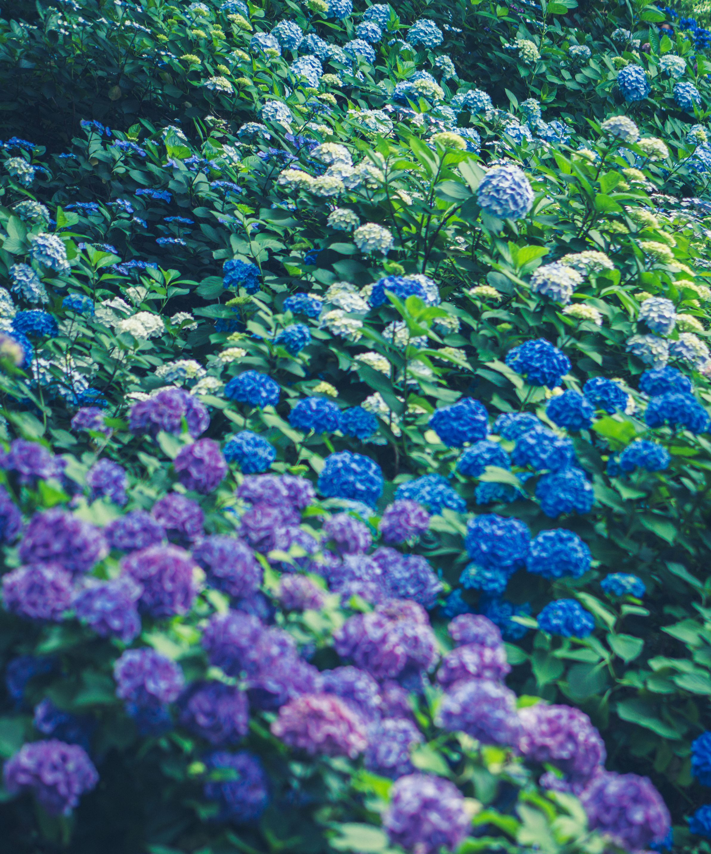 寒色系のグラデーションが美しい、満開の紫陽花。 形原温泉の広大な敷地に咲き乱れていました。