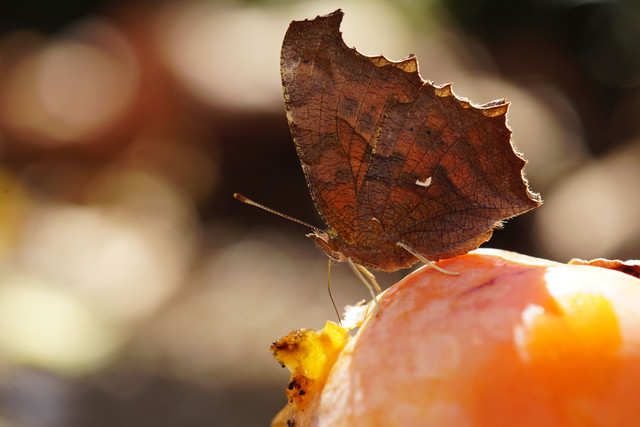 庭先の腐熟柿にやってきたキタテハ秋型。