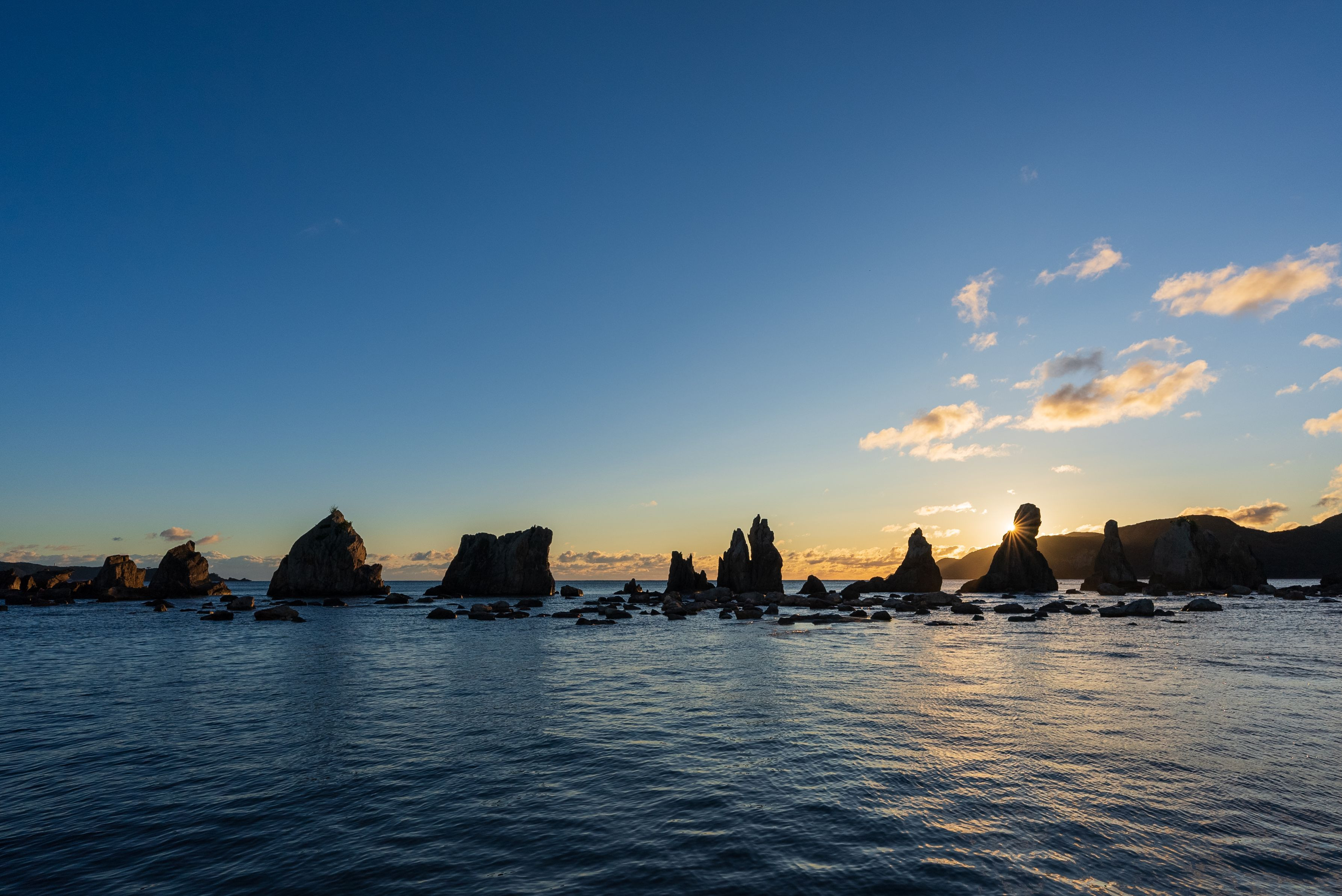 初車中泊での待ちに待った日出のワンショットです。(ロケ:和歌山県串本町 橋杭岩)