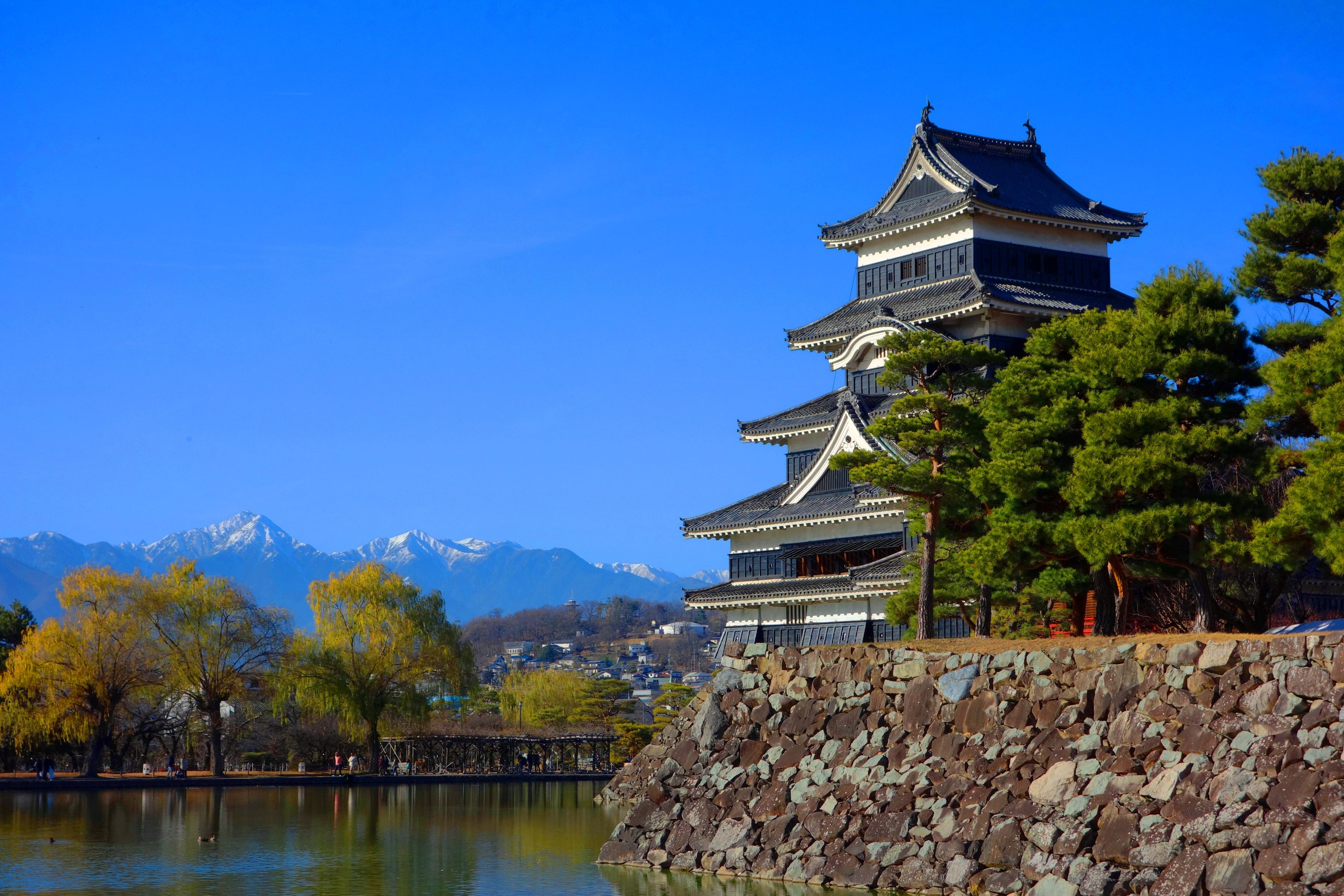 アルプスを抱える松本城。 快晴の良い日に出会えました。