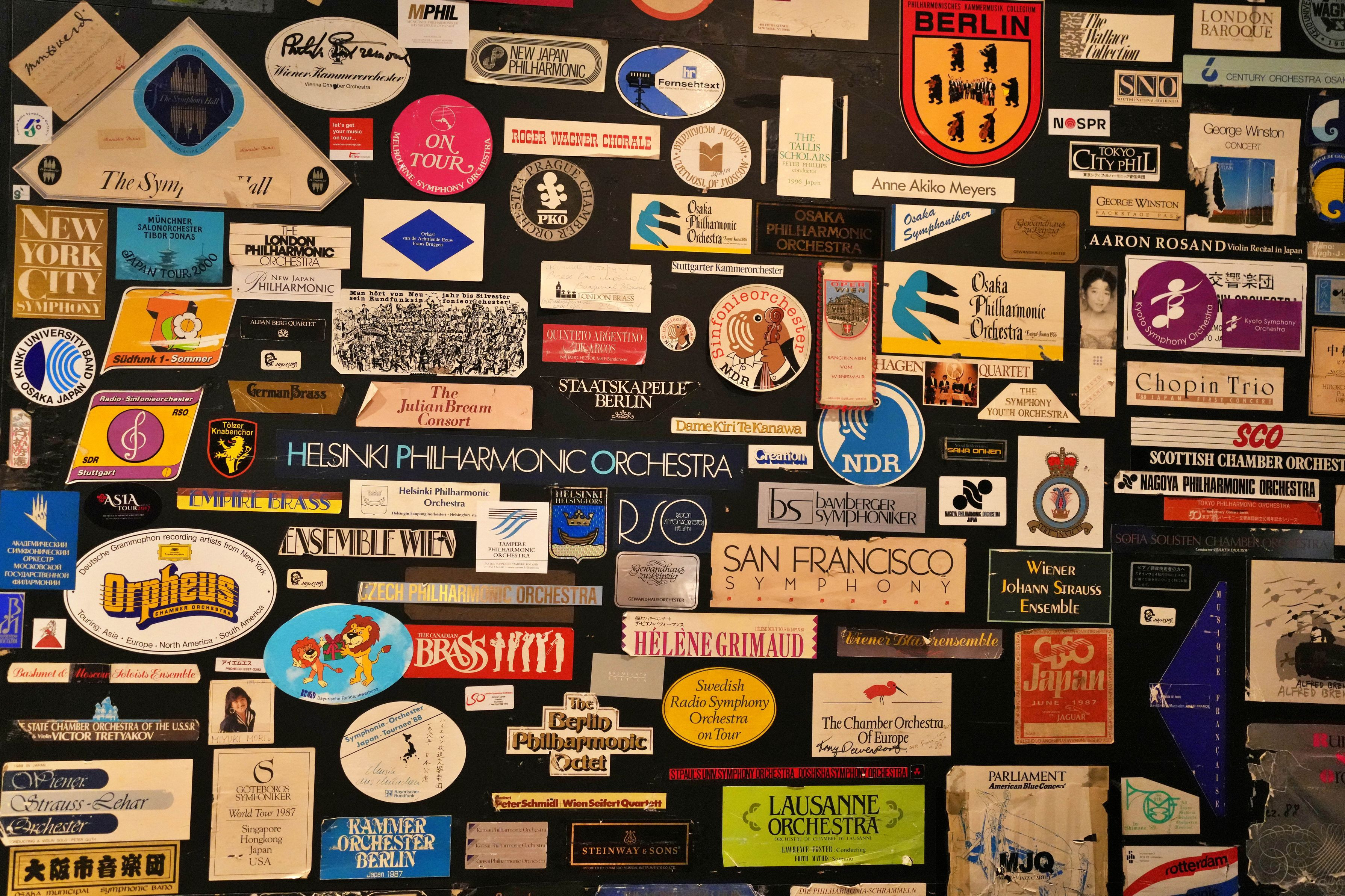 コンサートホールの舞台袖の壁にはこれまでここで公演してきたいろんな楽団のシールとかがベタベタ貼ってあります。これは全世界共通の習わしです。 これを眺めるのが結構好き。 これは出演者じゃなきゃ見られませんよね。