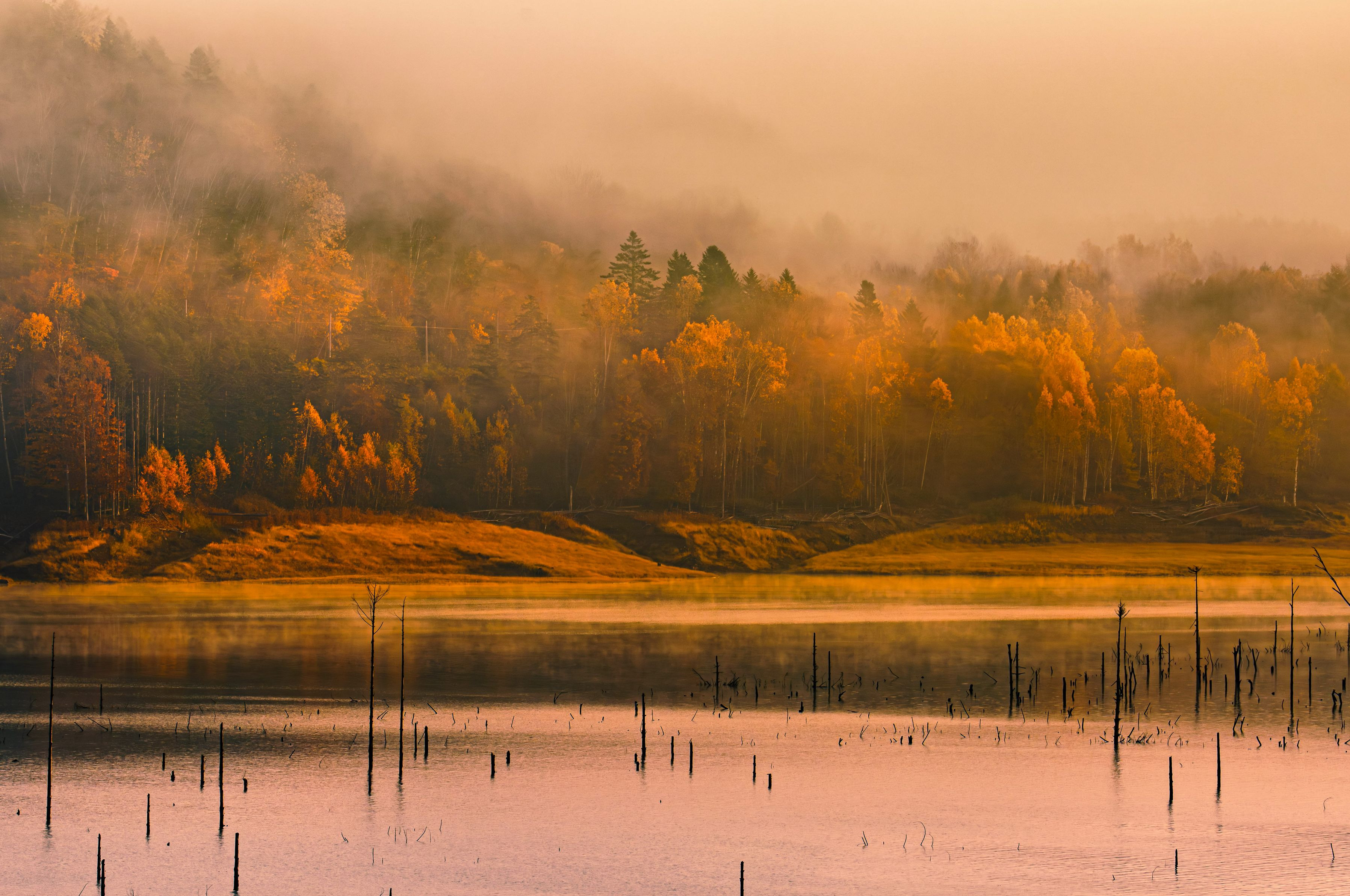 濃い霧も少しは抜け湖畔が見えてくると毛嵐が 燃えていそうな秋でした 北海道シューパロ湖