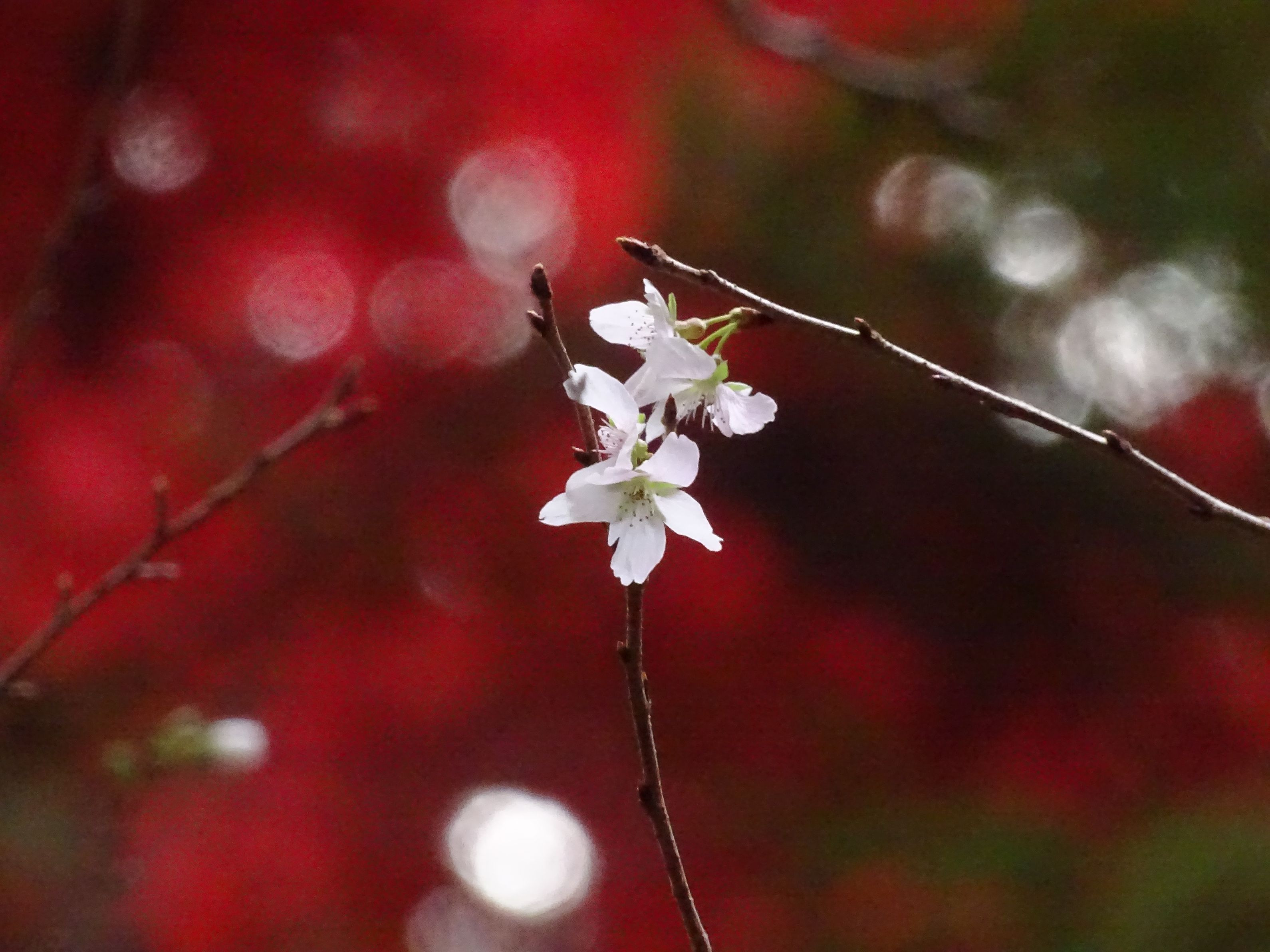 紅葉狩りに行った時、モミジの中に1本だけ冬桜の木がありチラホラと花が咲いていました
