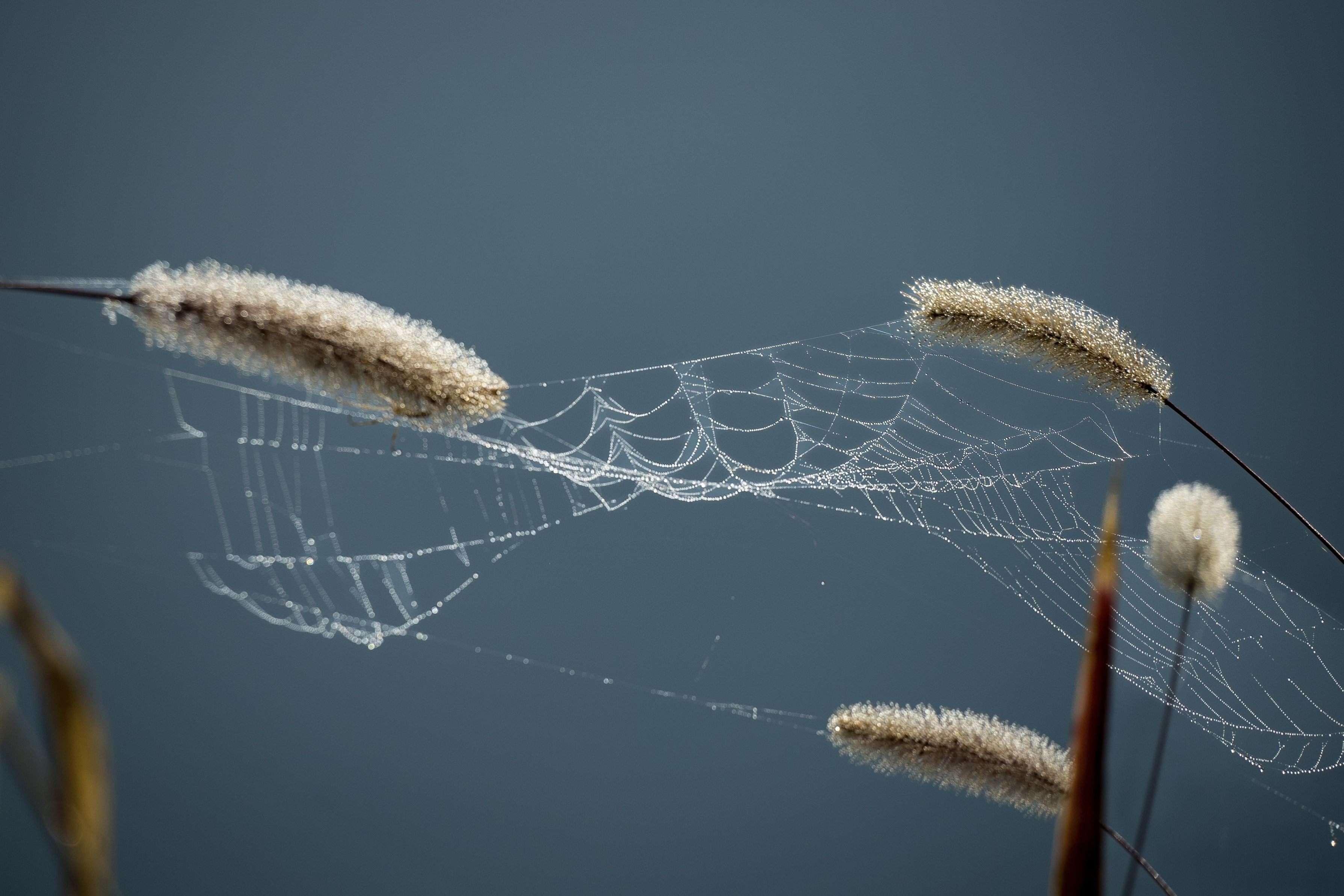 朝霧が立ち込めた朝、蜘蛛の巣に細かな水滴がつき、芸術的な美しさでした