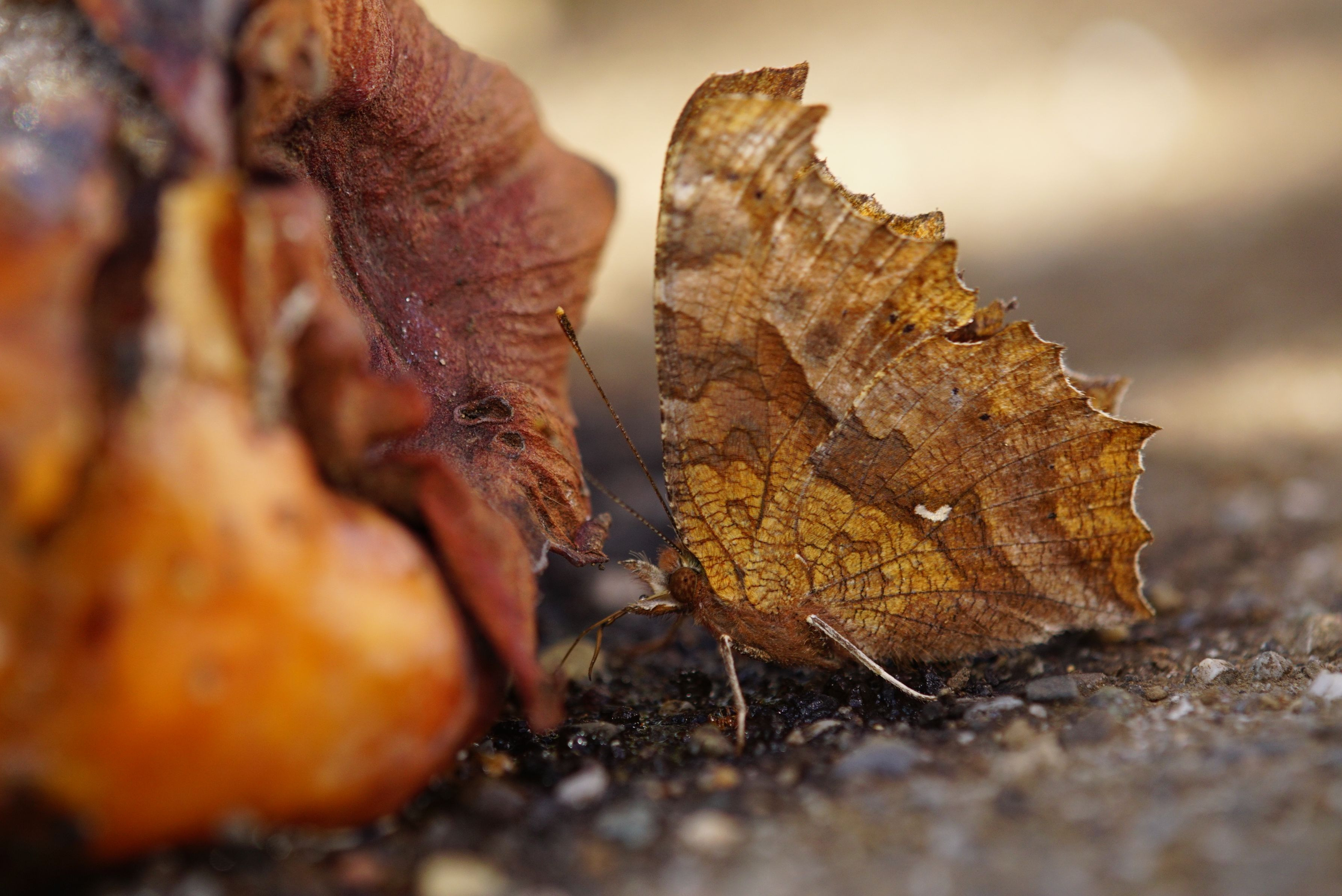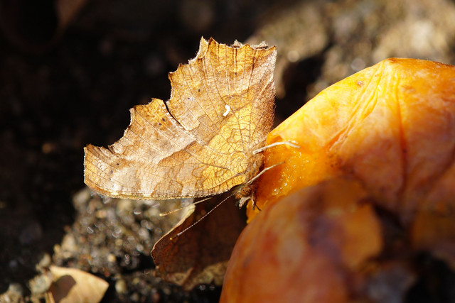 庭先の腐熟柿にやってきたキタテハ秋型。使用レンズはタムロンSPAF180mmF3.5Diマクロです。MF+Fullで11/2に撮影。