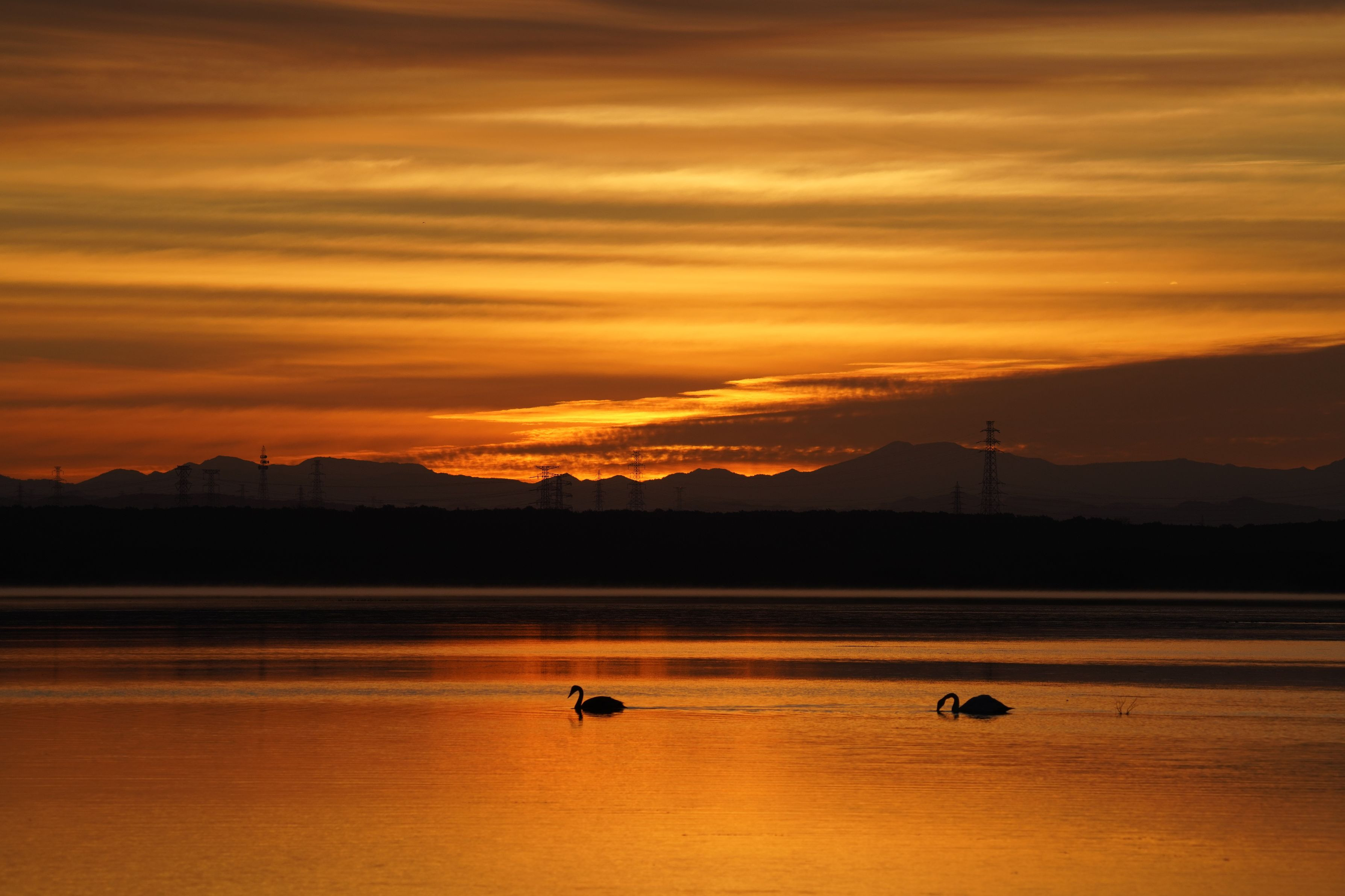 製品情報>My Sony>αcafe>朝焼けが眩しいウトナイ湖:2羽のハクチョウ(デカ橋さん)