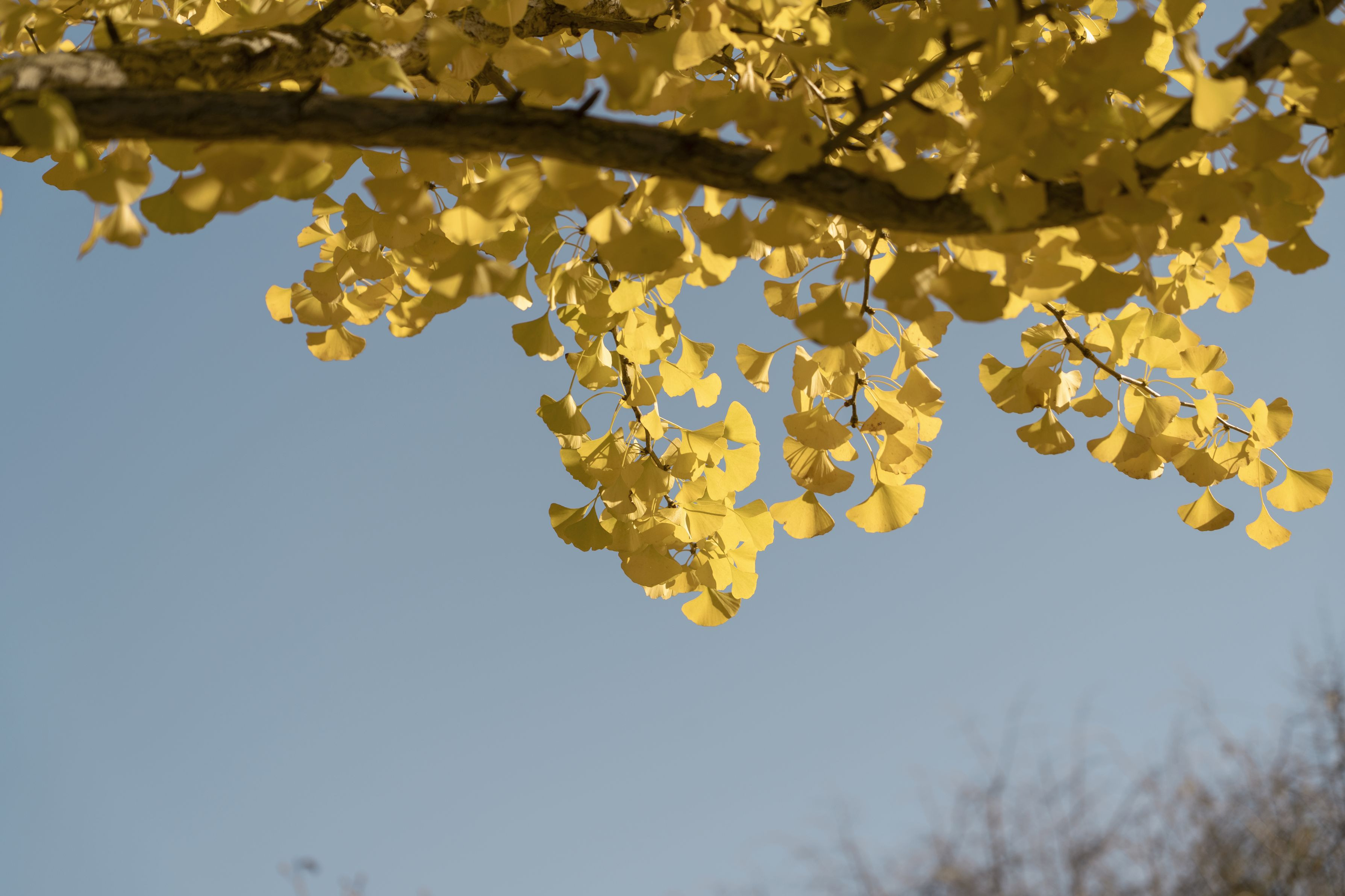 深まった秋に葉が落ちた木々の合間を縫って、イチョウ葉が色づき、冬の訪れを知らせてくれています