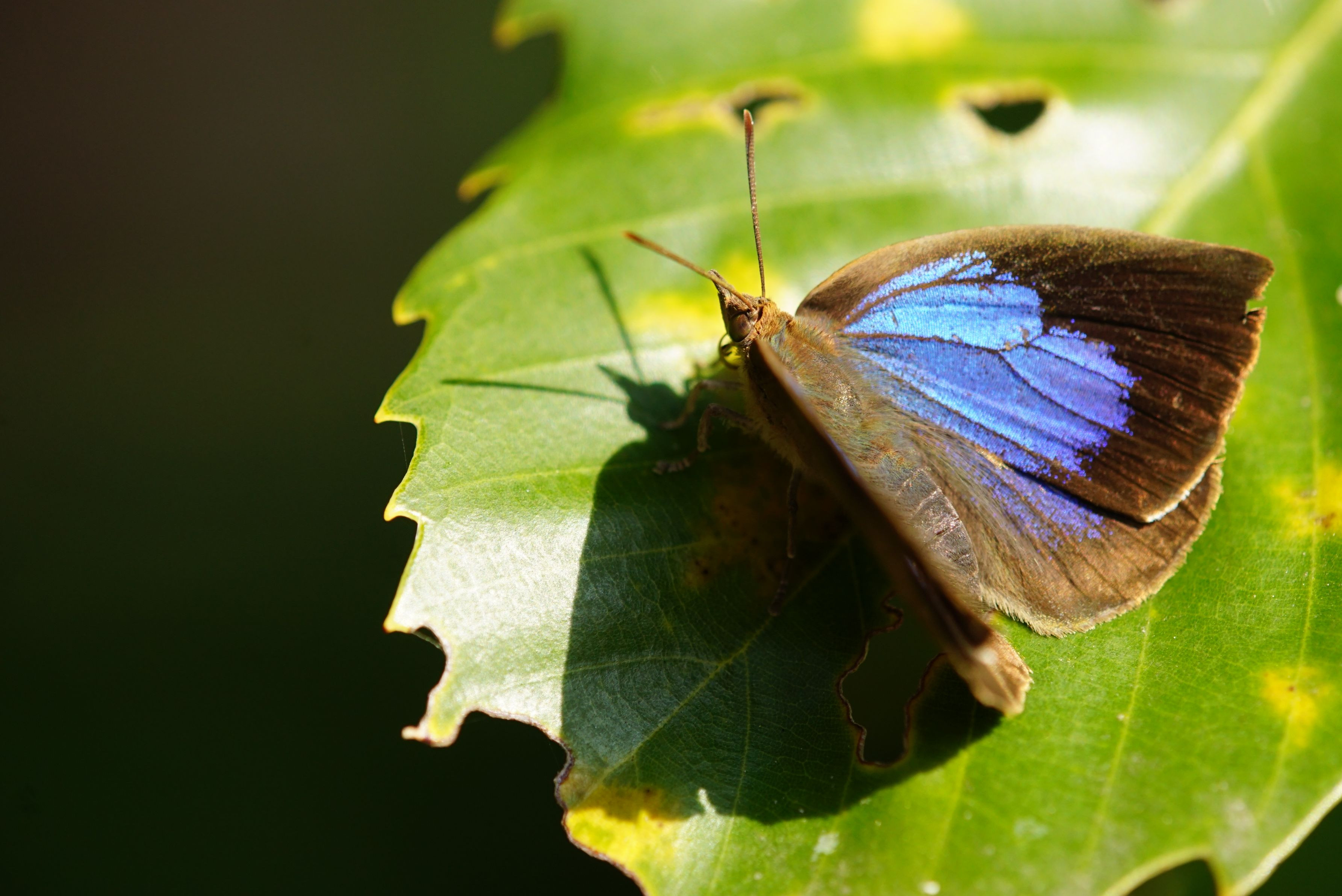 食樹のひとつである、アラカシで日向ぼっこ中のムラサキシジミ♀。