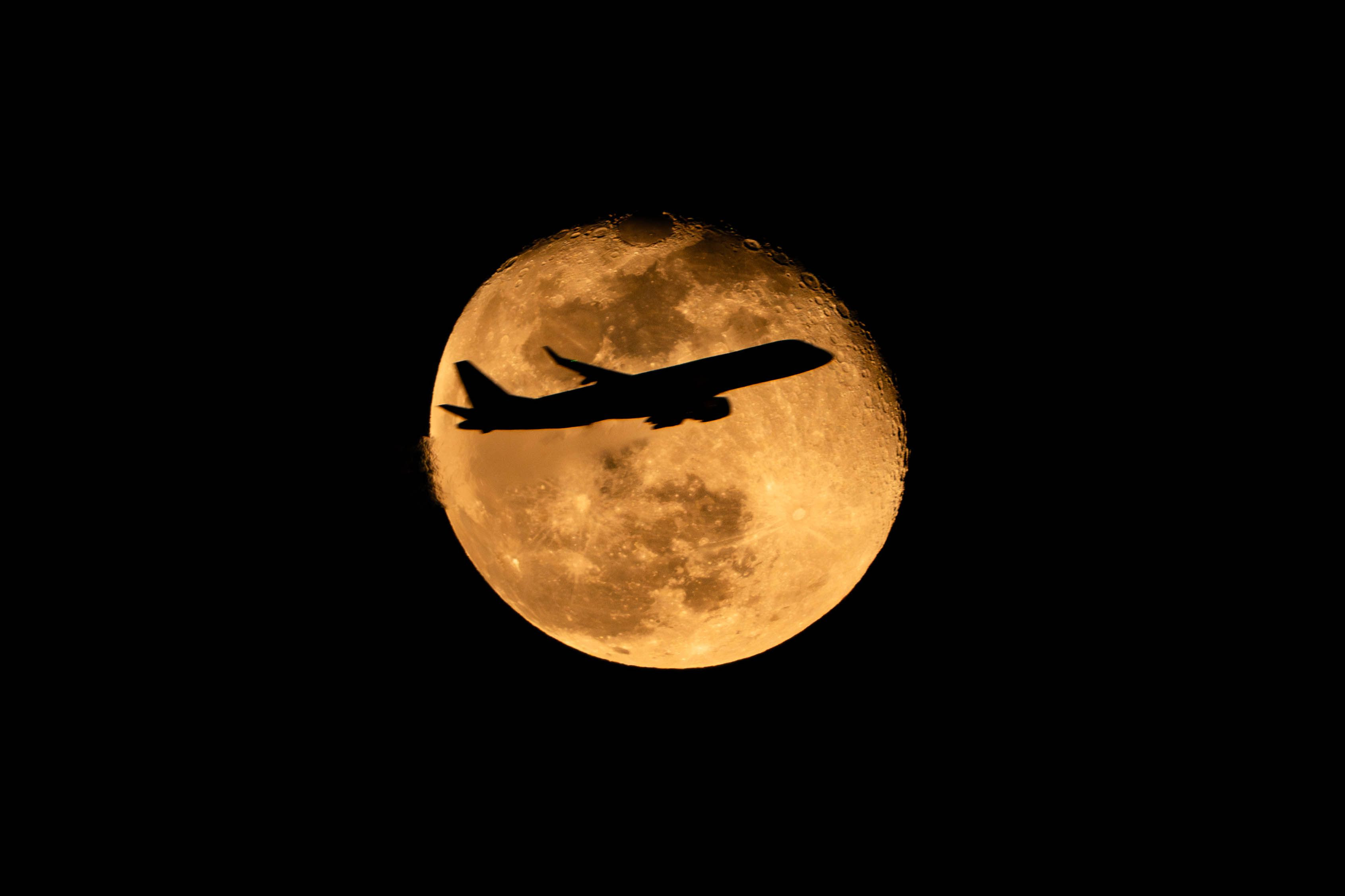 運良く月にぴったりなサイズ感で月丼が撮れました。大阪空港から離陸後左旋回中の飛行機を西宮側から撮影しました。
