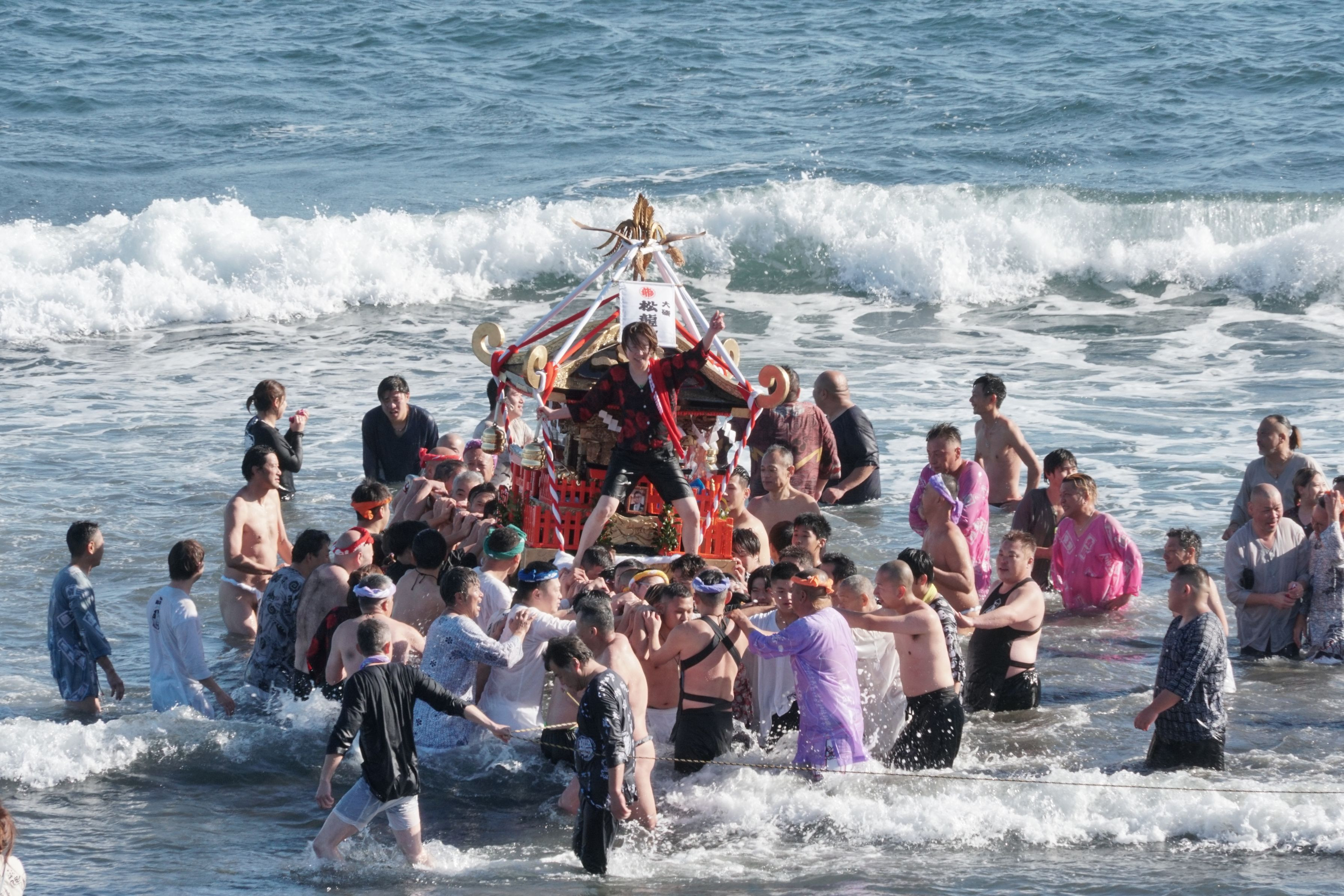 大磯寒中神輿。北浜海岸の兜岩前にて、初春のお祝いと練成を兼ねて勇敢に海中に入り、一年の安泰と賑わいの創出を図る。#大磯フォトコン2023