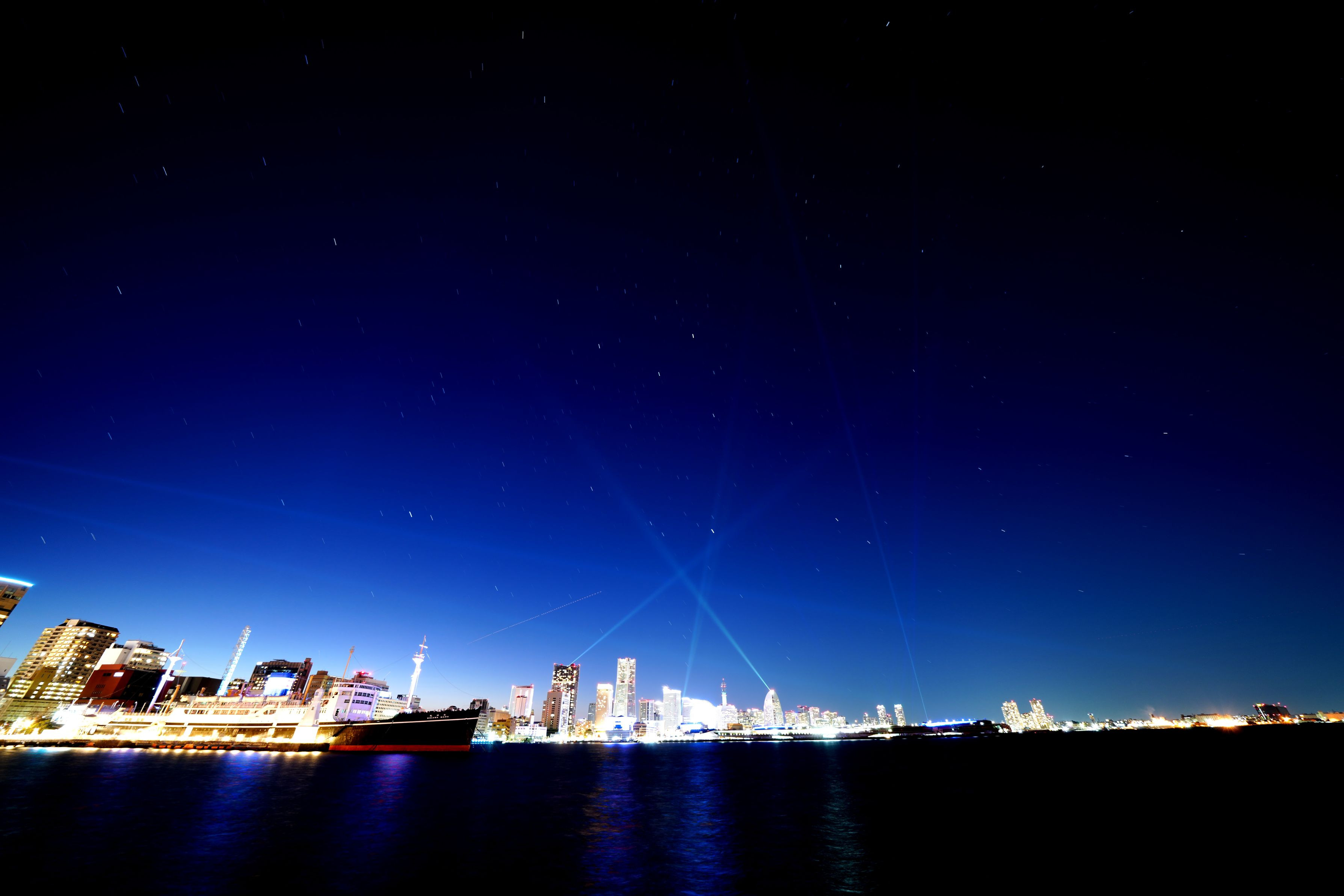 新年あけましておめでとうございます。 本年もよろしくお願いします。 山下埠頭のガンダム前からMM方面を撮影しました 12枚の比較明合成です。