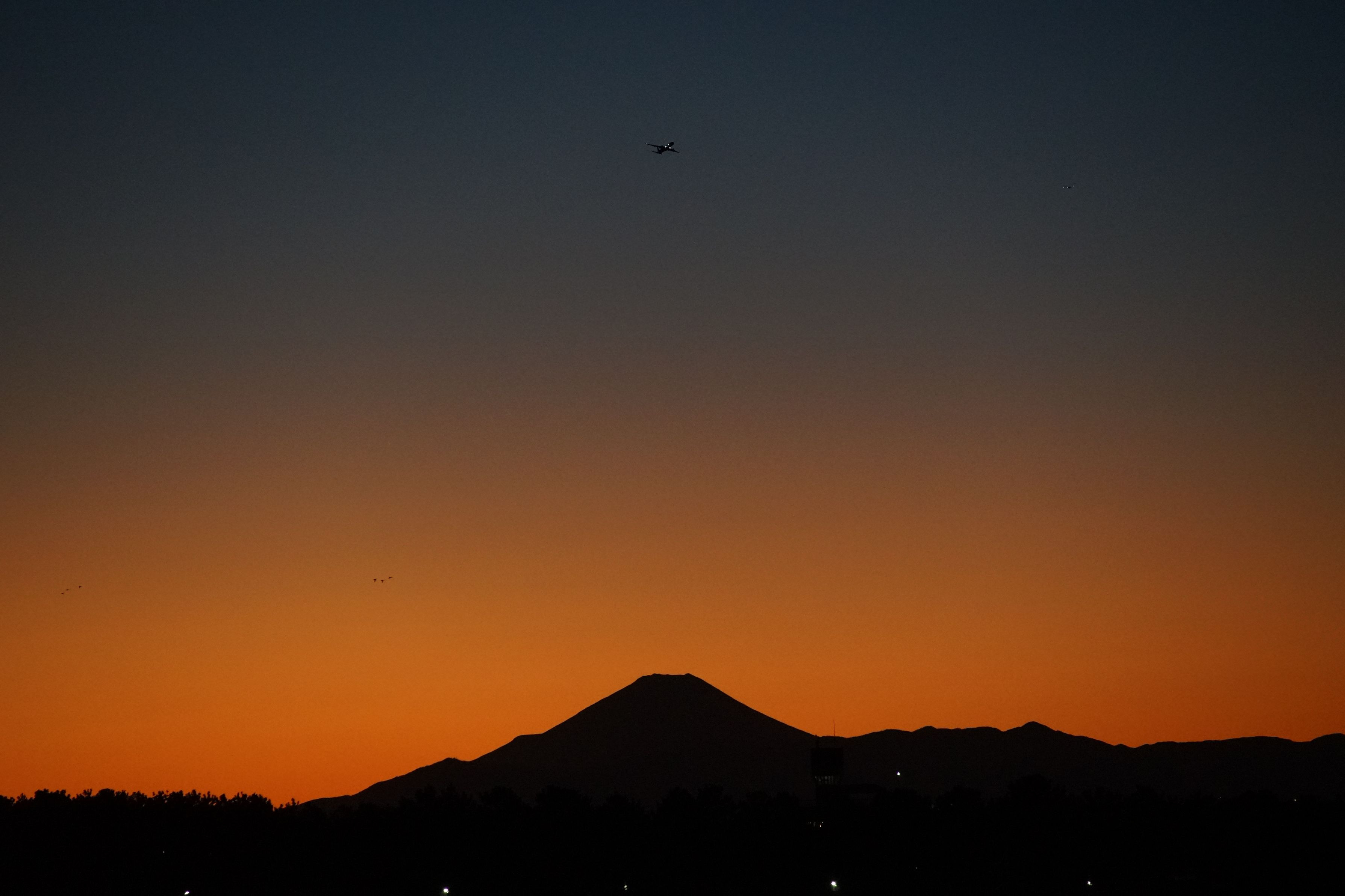 風が強く上空の雲を寄せ付けず 橙色と紺色、そしてシルエット 航路を変えた機影も上空はるか上