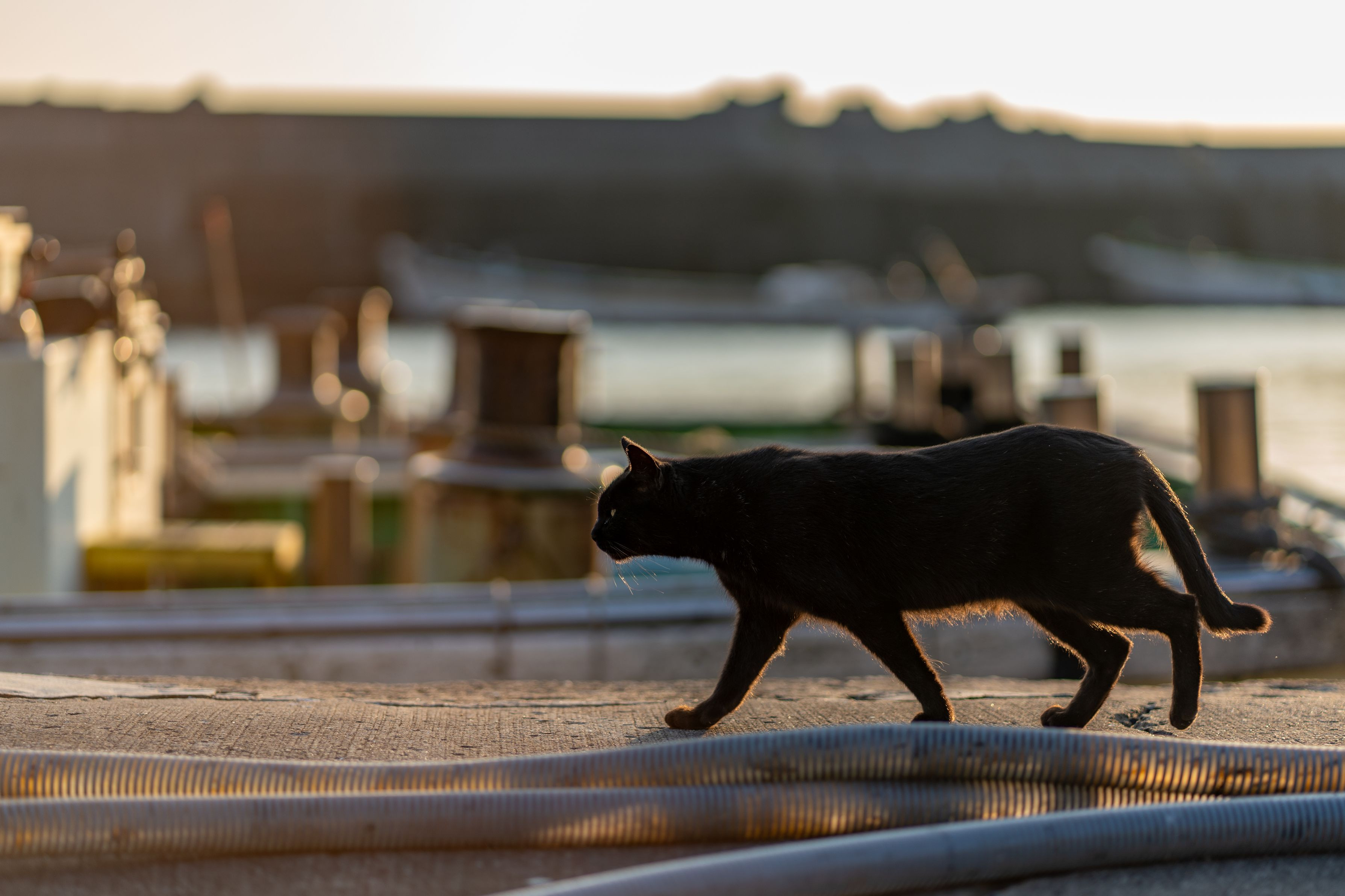 地元の漁港で夕陽の中お散歩する黒猫ちゃんに出会いました。