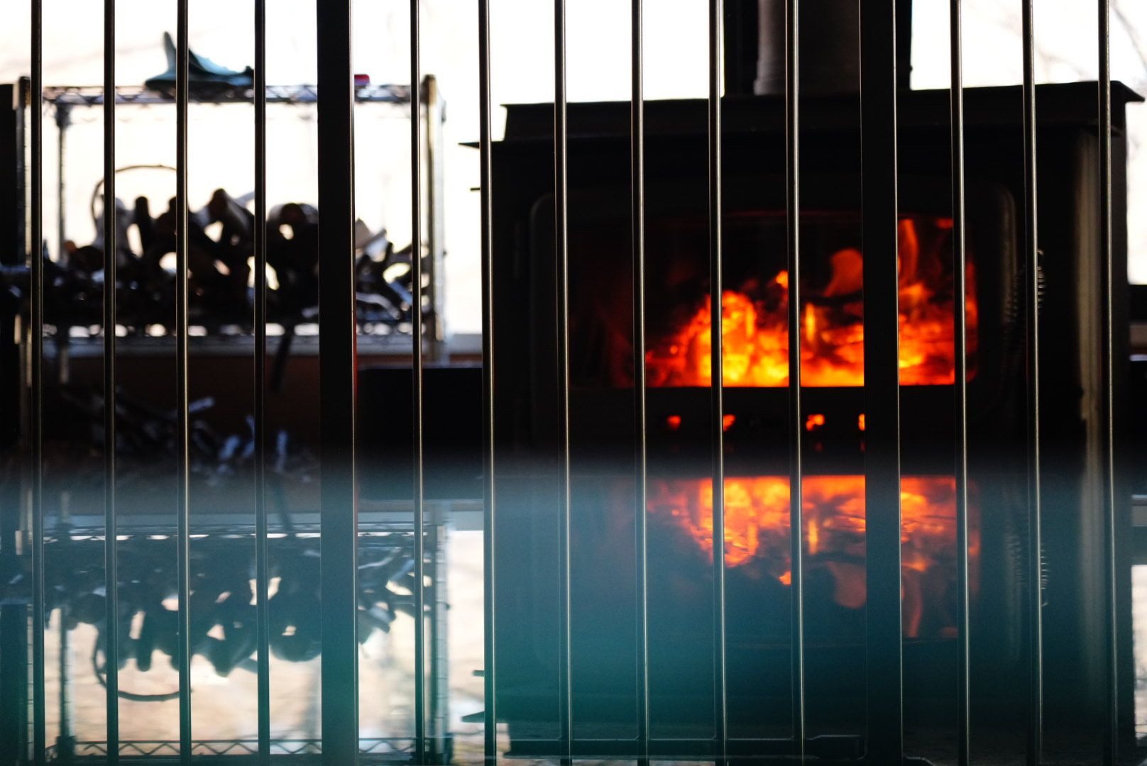 ガラステーブルに反射する暖炉の炎が、静かな空間を作り出していました
