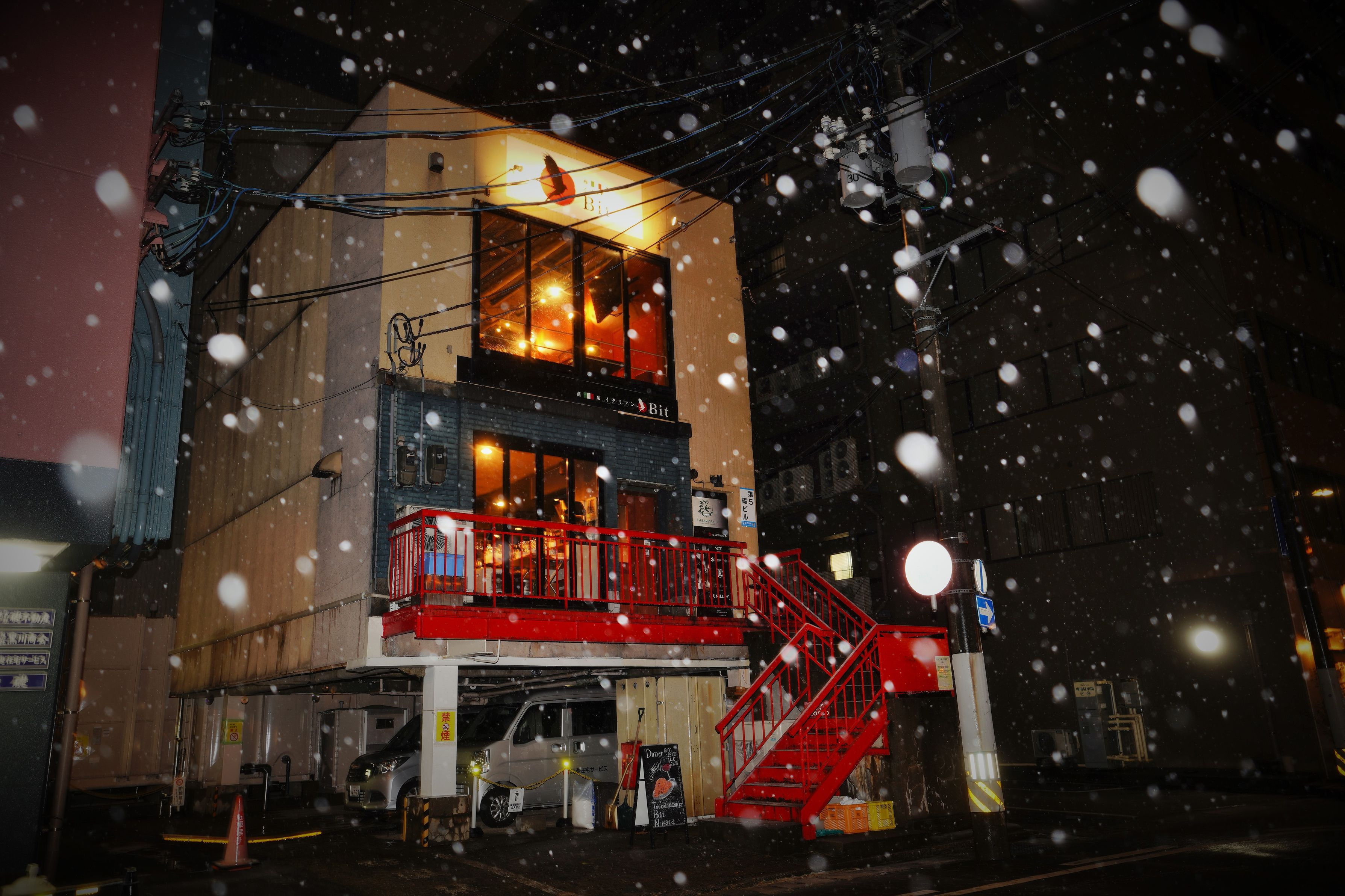 新潟にあるイタリアンレストランのBitの雪景色です。 赤い外階段を入れて撮りました。