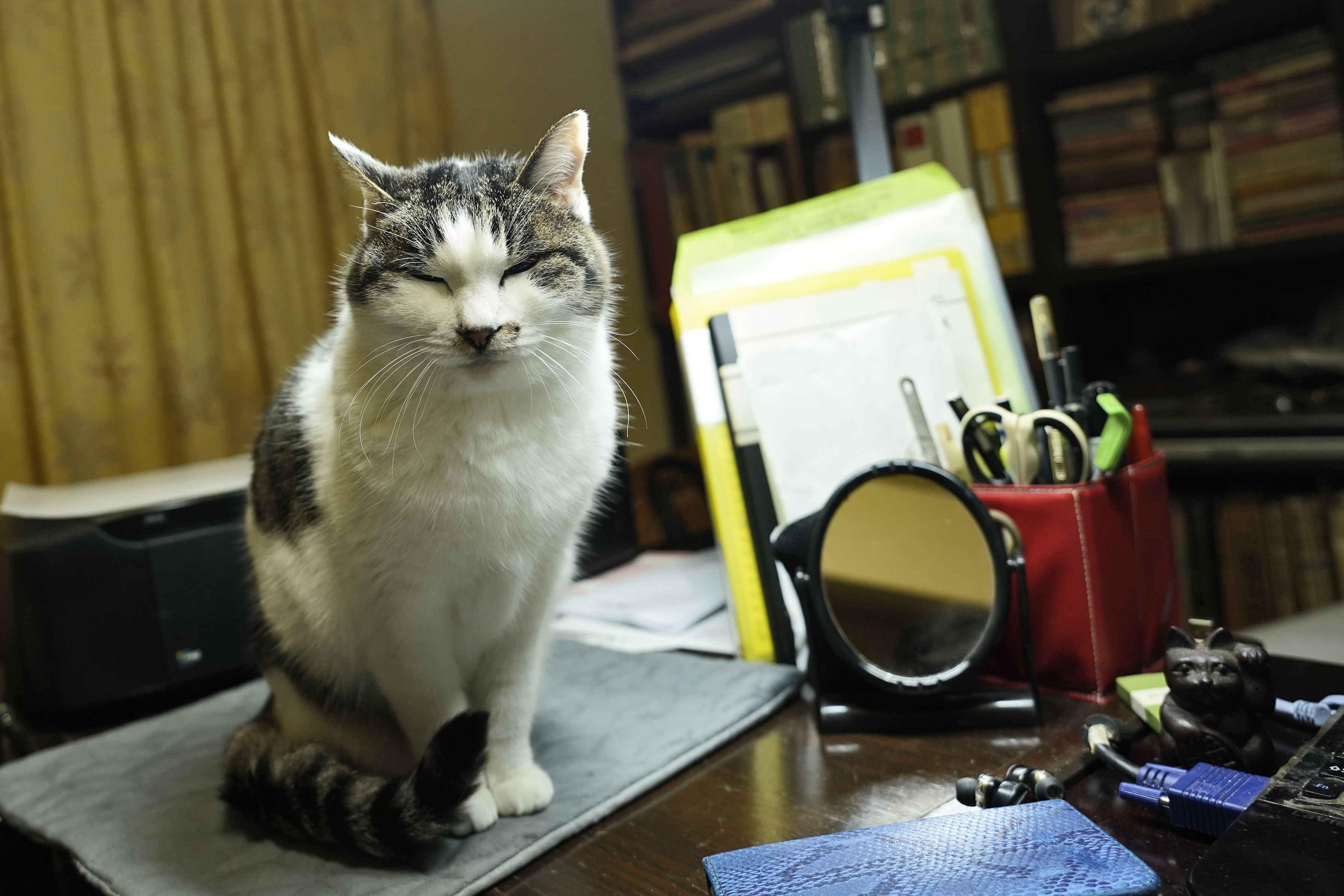 うちの球(たま)ちゃんは、冬場寒いと、 仕事場の机の上にいつもちょこんとゐます。 時折猫というよりフクロウのように感じることがありますね。^^