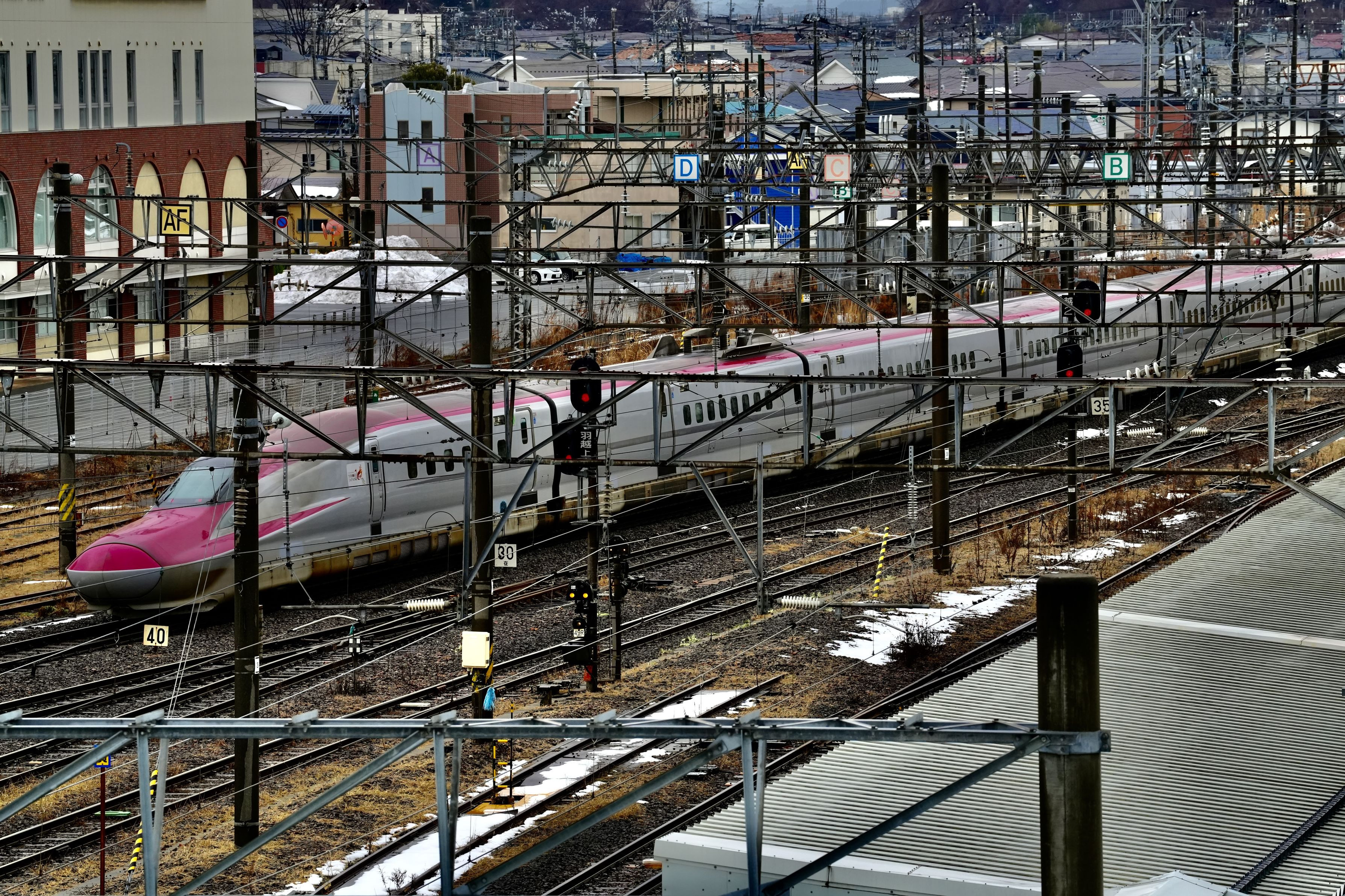秋田新幹線こまち 駅ビル駐車場からホームを出発した上り線を狙いました。 FE70-200mm f2.8 GM OSSⅡ にて撮影。
