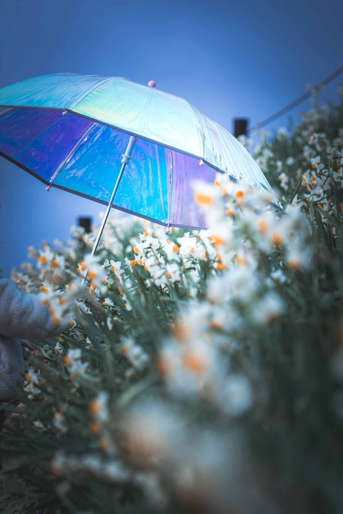 水仙の丘に行くと小雨が降り始めて、娘がそっとスイセンの花に傘をさしてあげたところです。
