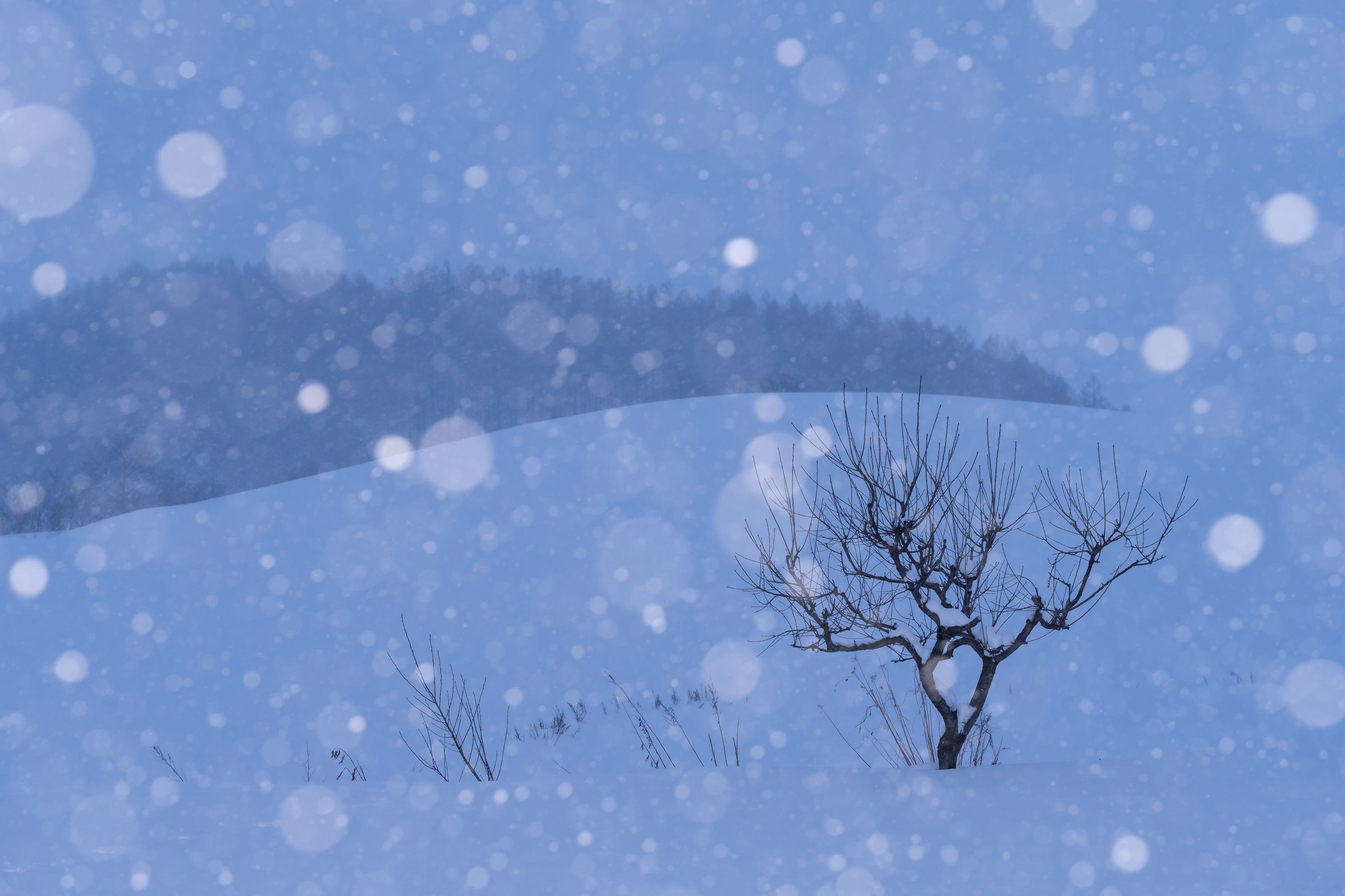 雪の前ボケに丘の稜線と背景の山が綺麗だったため撮影しました。 日の出前の静けさを表現するために背景は少し青目に、 雪の前ボケは白くなるように調整しました。