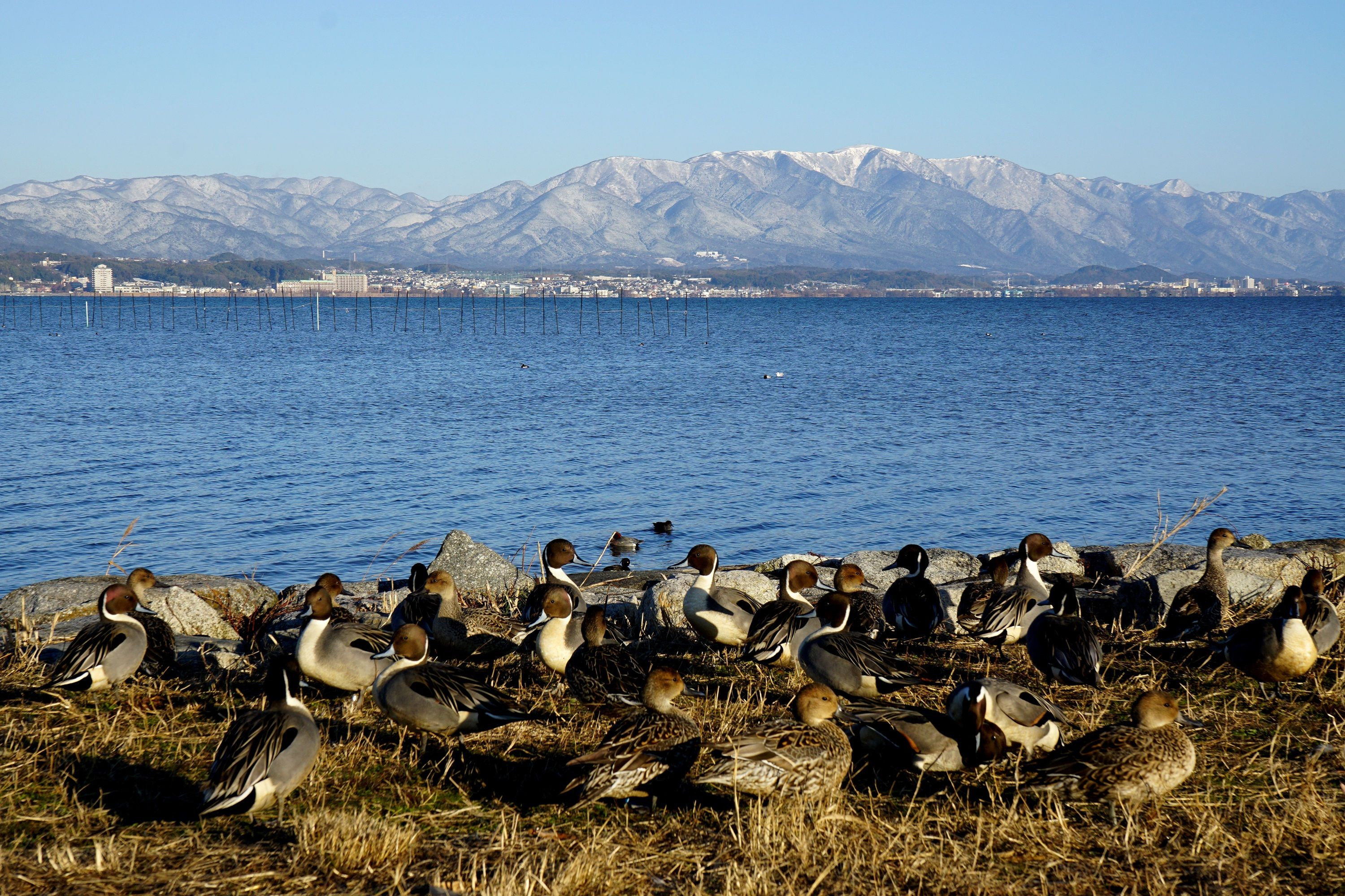 製品情報>My Sony>αcafe>「青空と冠雪比良とオナガガモ」(bluebird2021さん)