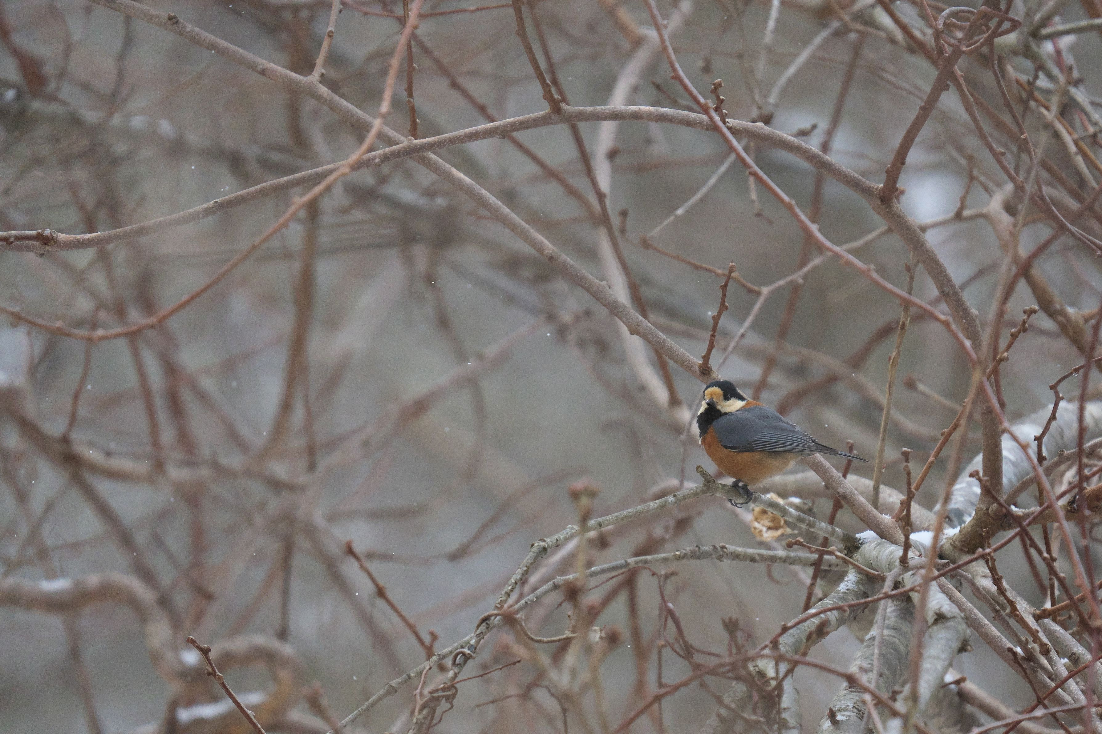 カメラとレンズを新調したので練習にでかけました。 雪が舞い始める中の一枚。 #ヤマガラ