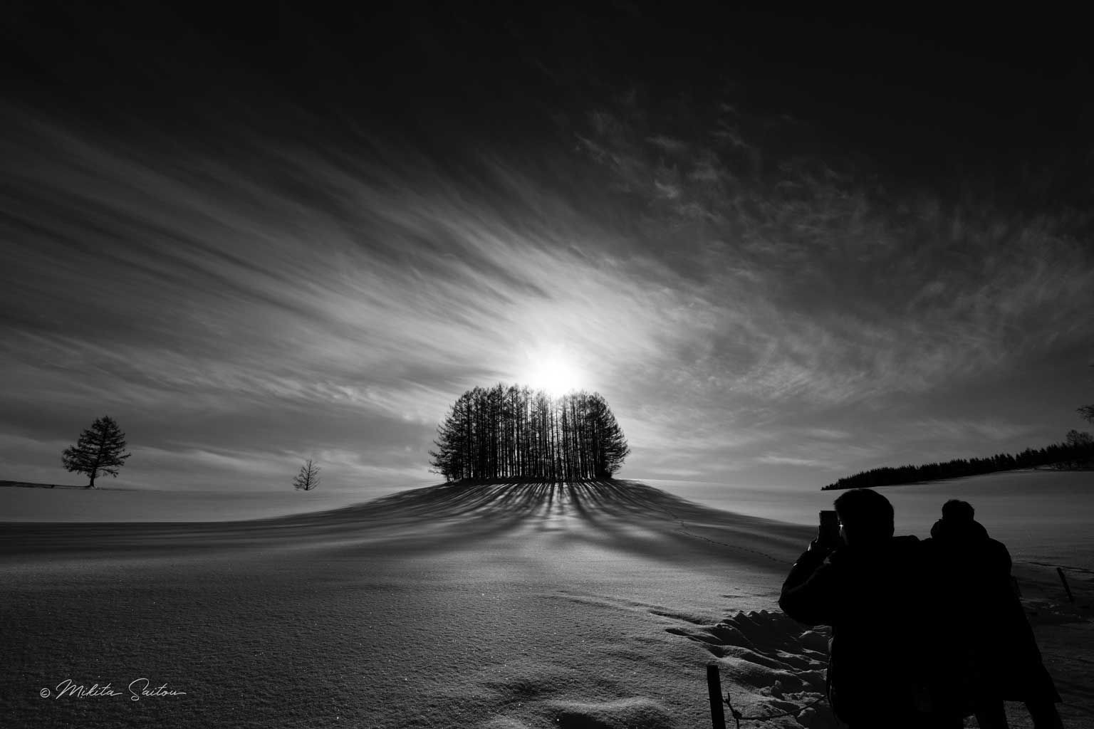 1月中旬に美瑛のマイルドセブンの丘の影は最も長く伸びます。本当は太陽がマイルドセブンの丘の真上に来るところを撮りたかったのですが、この日は30分ほど遅刻。そのためクリエイティブルックをいろいろ試してみることにしました。進入禁止のロープを超えて無惨な足跡が残っています。夢中で撮ろうとしている人たちもあえて構図に入れました。土地は農家の大切なもの。マナーを守らないと、いつか撮らせてもらえなくなります。