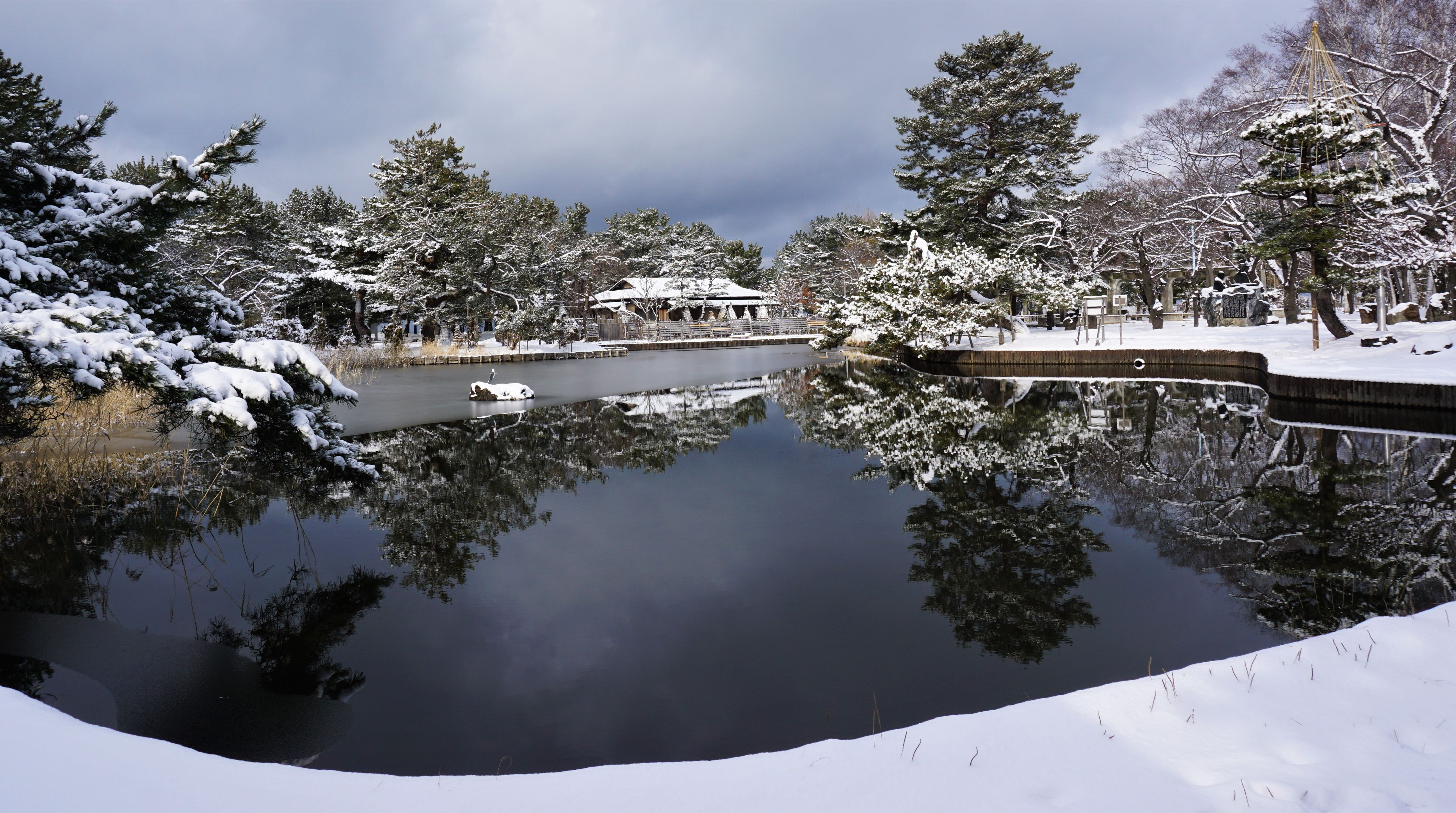 雪晴れの朝、水鏡に映る合浦公園の景色は真空の世界のようでした。海岸を有する公園には雪の積もった砂浜に鴨さんの姿がありましたので、動画に収めムービーとして投稿しています。そちらも、ご覧いただければ幸いです。