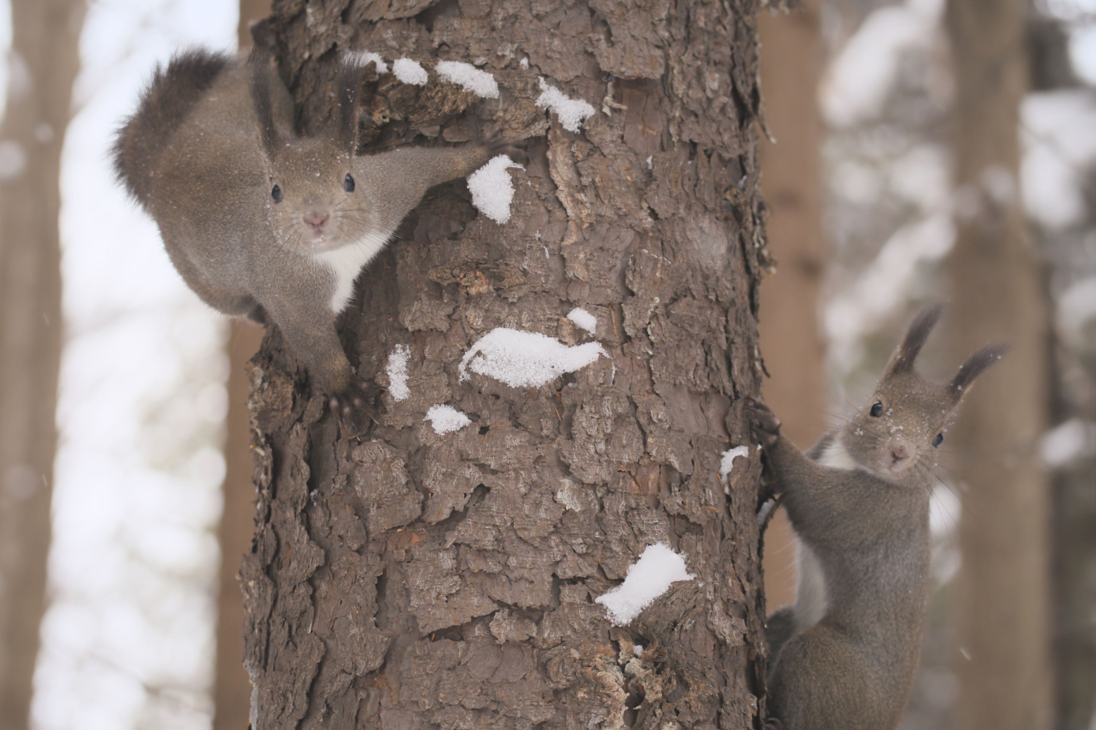 2匹で走り回っているエゾリスがたまたま同じ木に登ってこちらを向いた瞬間を収められました。