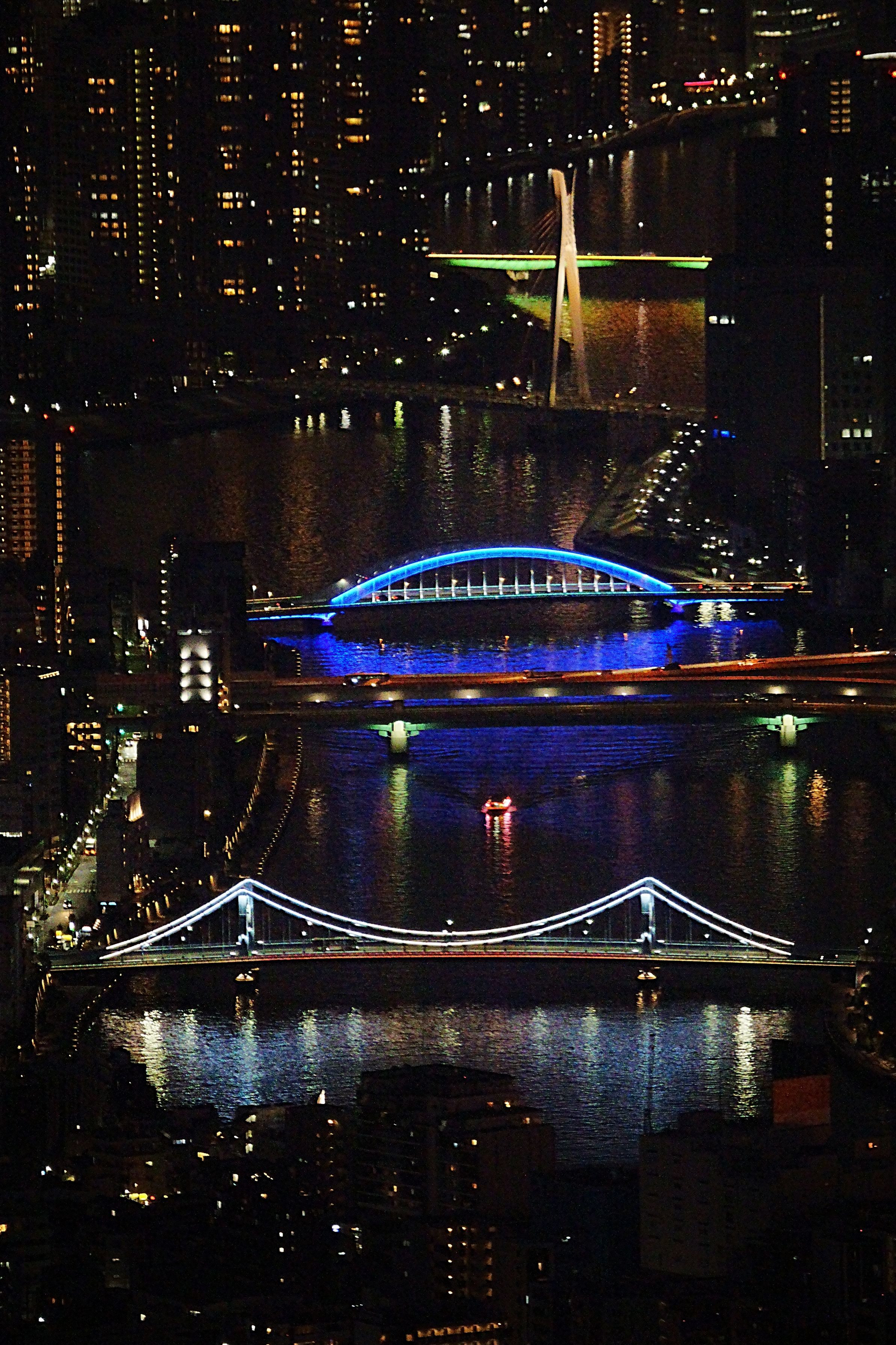 東京スカイツリーから見た隅田川にかかるライトアップされた橋と屋形船です。 手前から清洲橋、隅田川大橋、永代橋、中央大橋、佃大橋です。