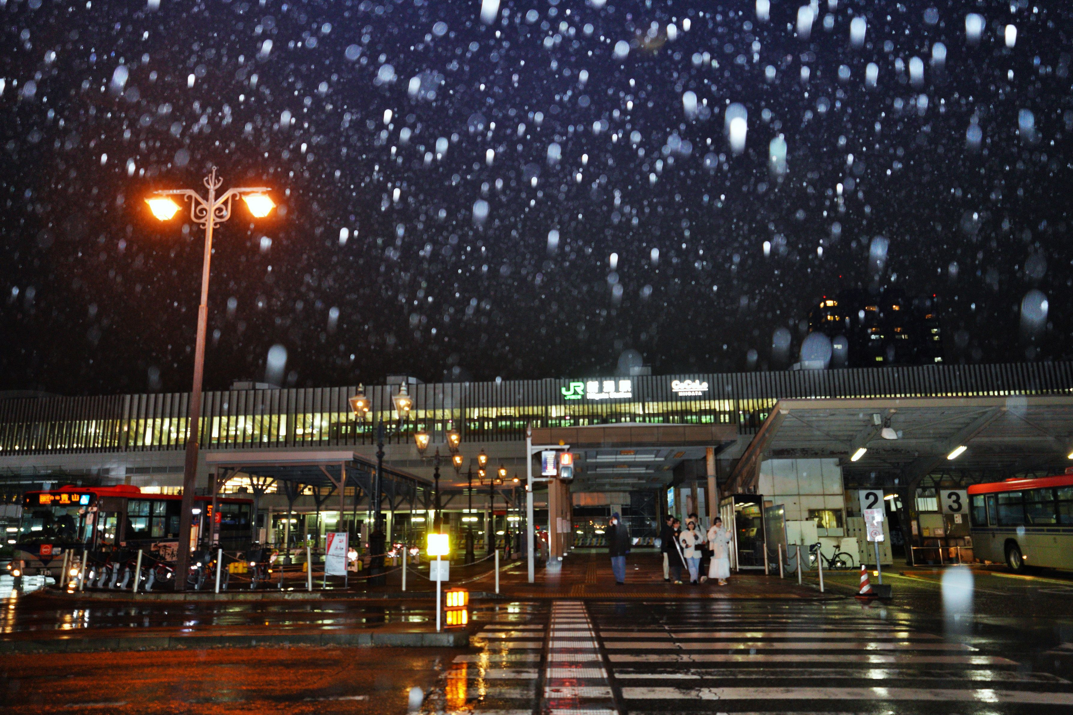 雨夜の新潟駅前です。新しいバスロータリーの工事が行われています。