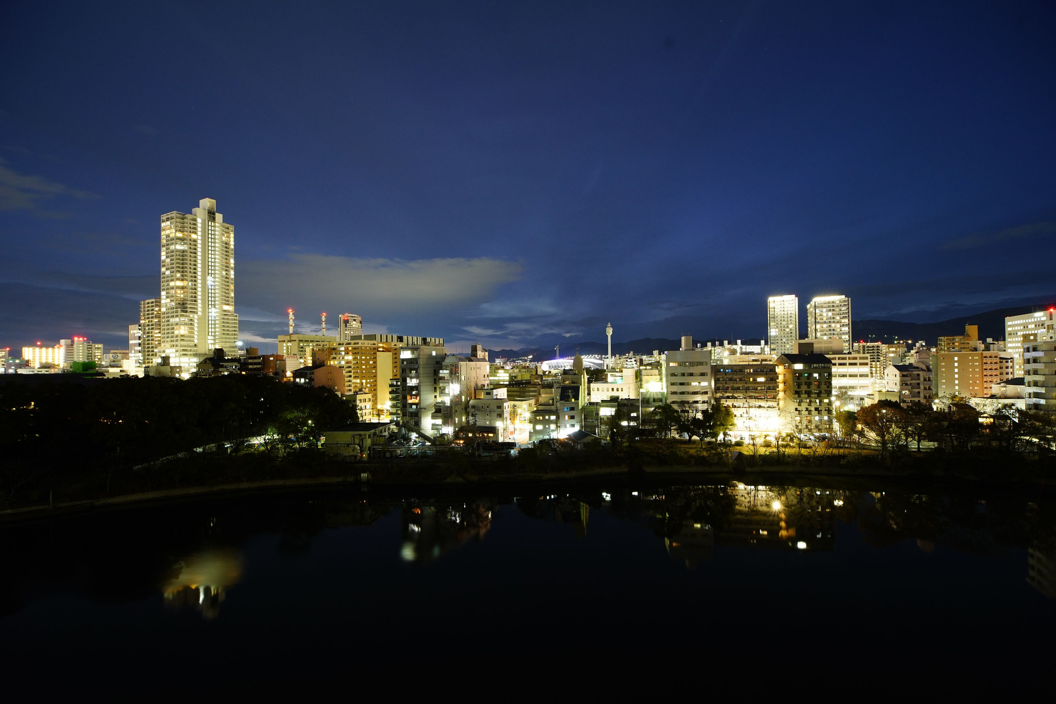 かつては広島七川(現在は六本)と呼ばれた川と橋の街です。 京橋川をはさみ対岸の縮景園とその向こうのピースウイング方面を新しい15㎜超広角で試し撮り。