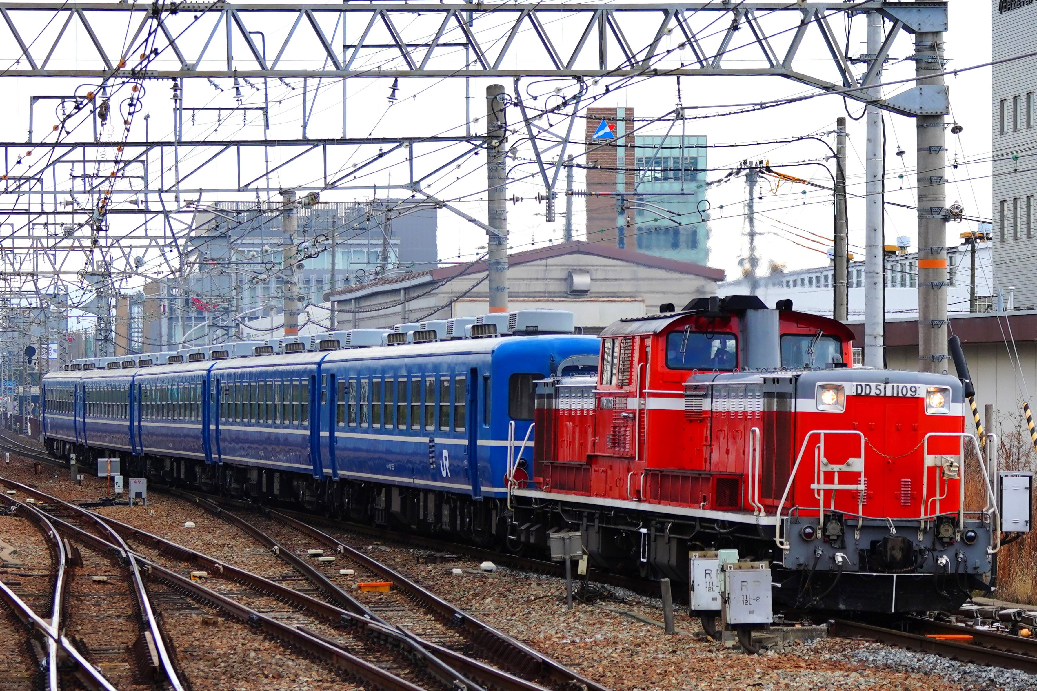 DD51 1109号機と12系ブルトレ5両の網干訓練が青信号で通過した 今日は運よく被りを回避できて楽しいチェイスでした(^^♪ 東海道本線 尼崎