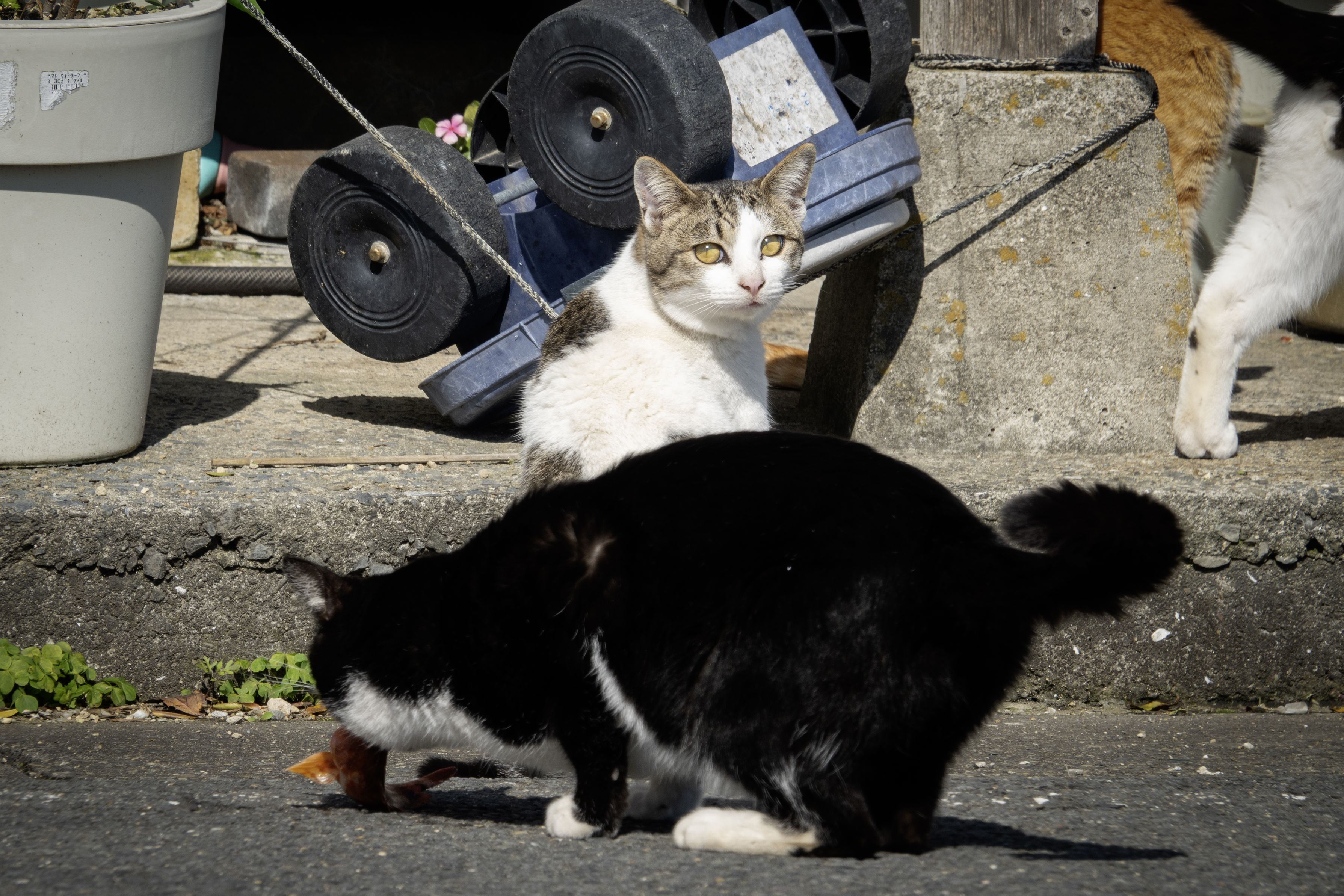 ご主人様の帰港を待ちわびていた猫達。見返り美猫の猫ちゃんの視線と、夢中で分け前のお魚を食べる猫ちゃんの対比がおもしろかった。