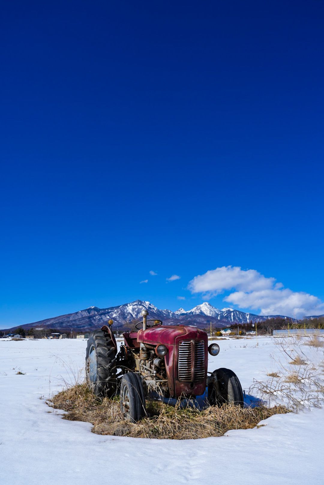 静かな雪の圃場。 八ヶ岳が澄んでいる。
