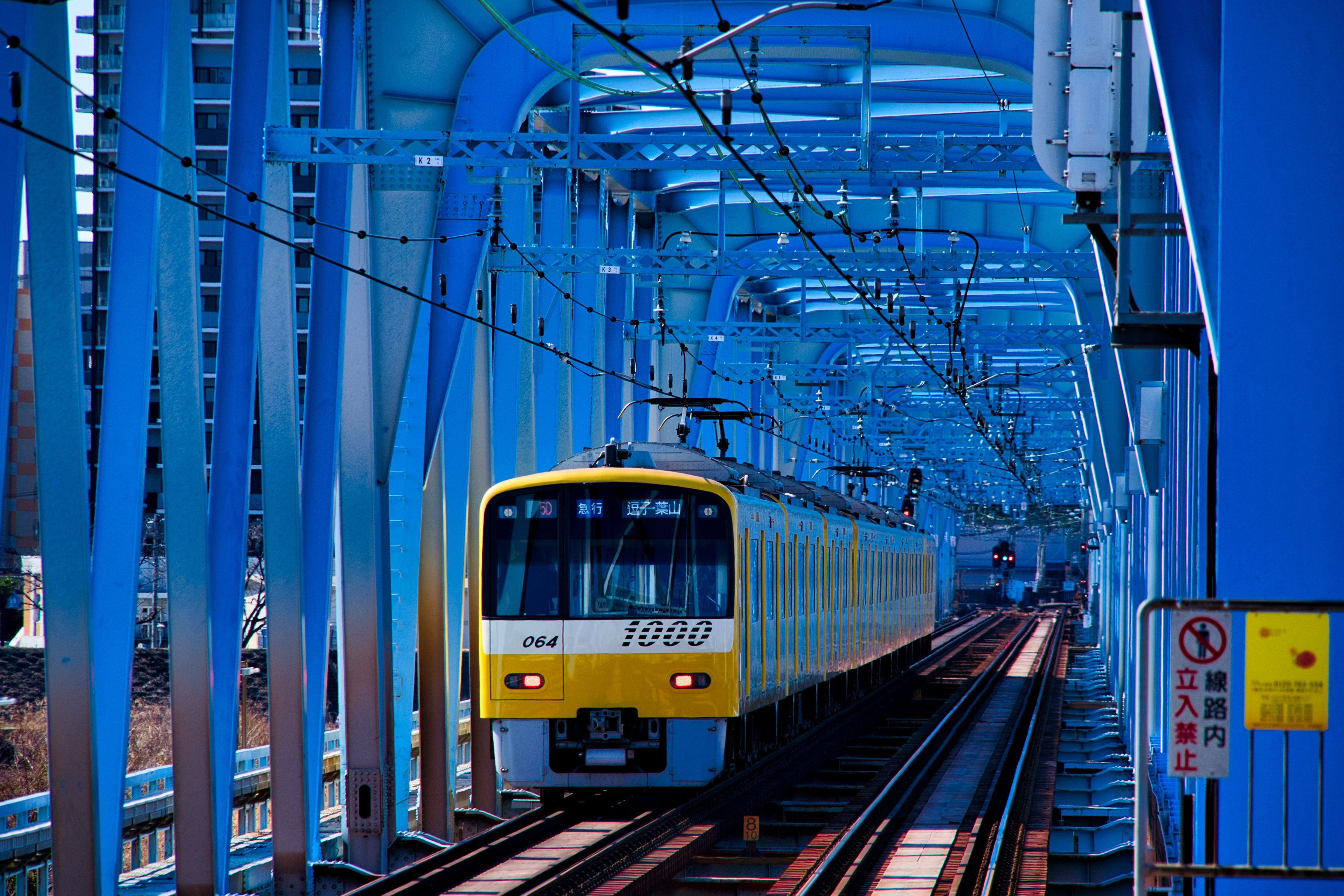 六郷土手駅ホームからトラス構造の六郷川橋梁を 通過する黄色い京浜急行風景です。 400㎜以上の望遠レンズがあるともっと表現の幅が広がると思います。