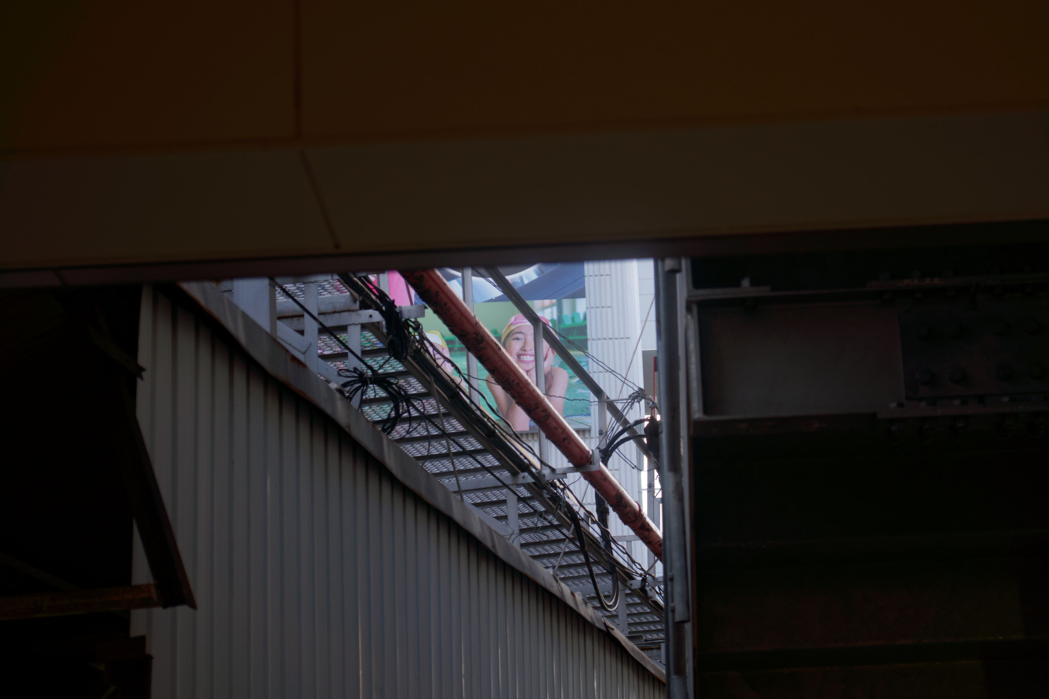 商店街のアーケードの隙間から見えた笑顔の広告。