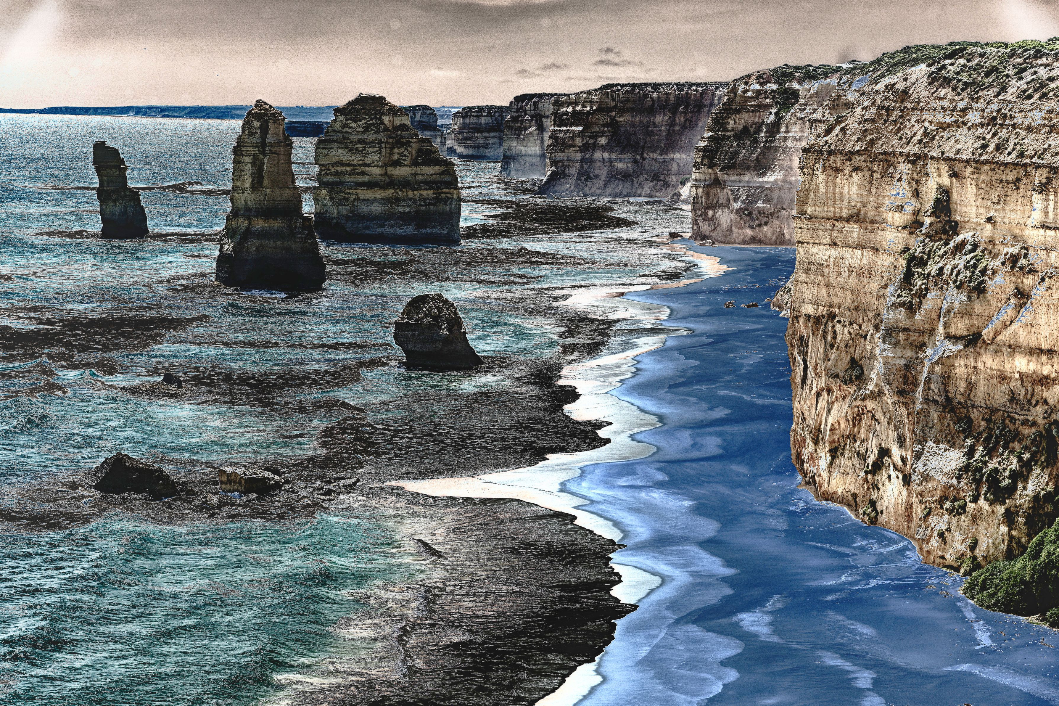 写真では先日旅したオーストラリア メルボルンからツアーで訪れた、グレートオーシャンロードのハイライトです。普通の写真では「絵葉書」になってしまうので絵画風に加工してみました。 3枚目に普通の撮影写真を載せておきました。