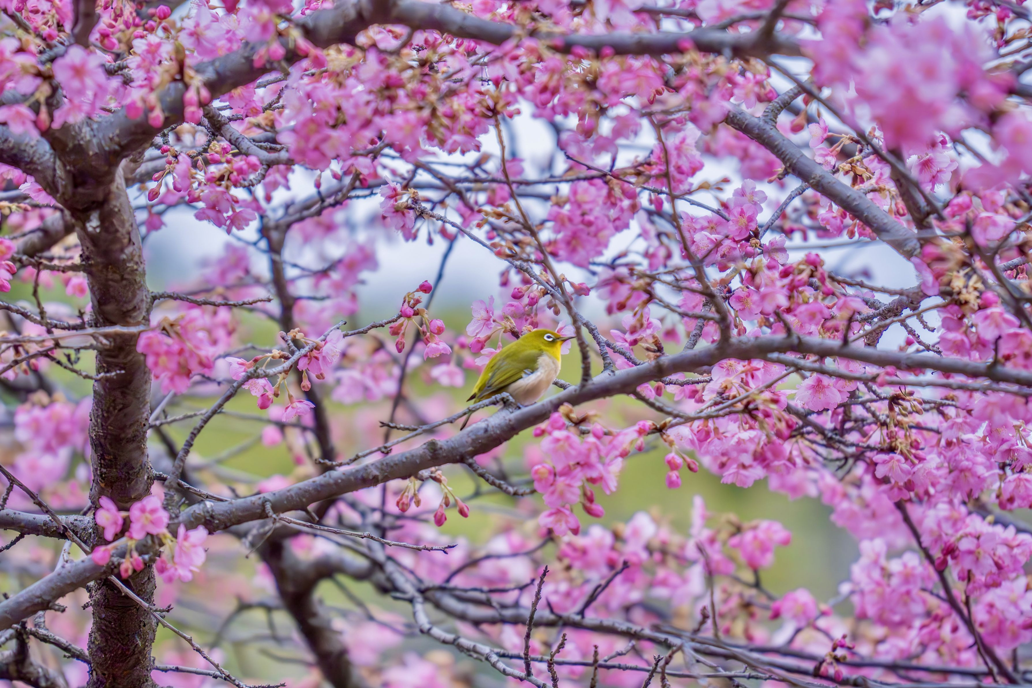 代々木公園の河津桜とご飯を食べにきたメジロです。