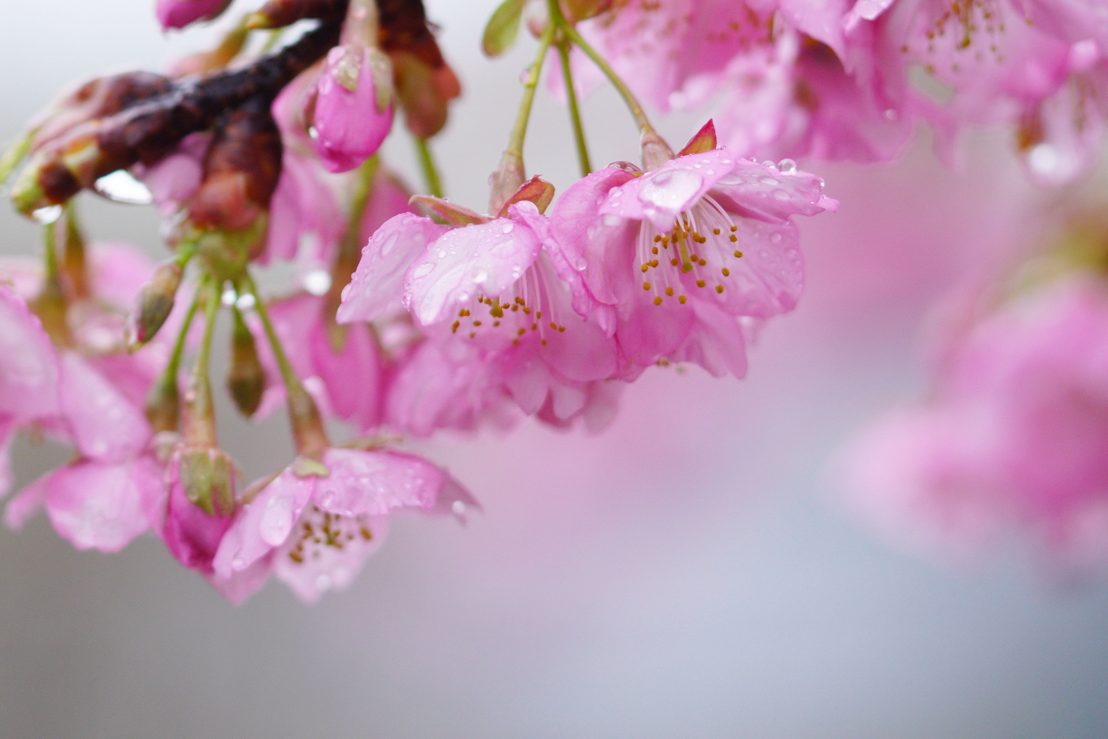 近くの公園の河津さくらが雨に打たれていました 💧