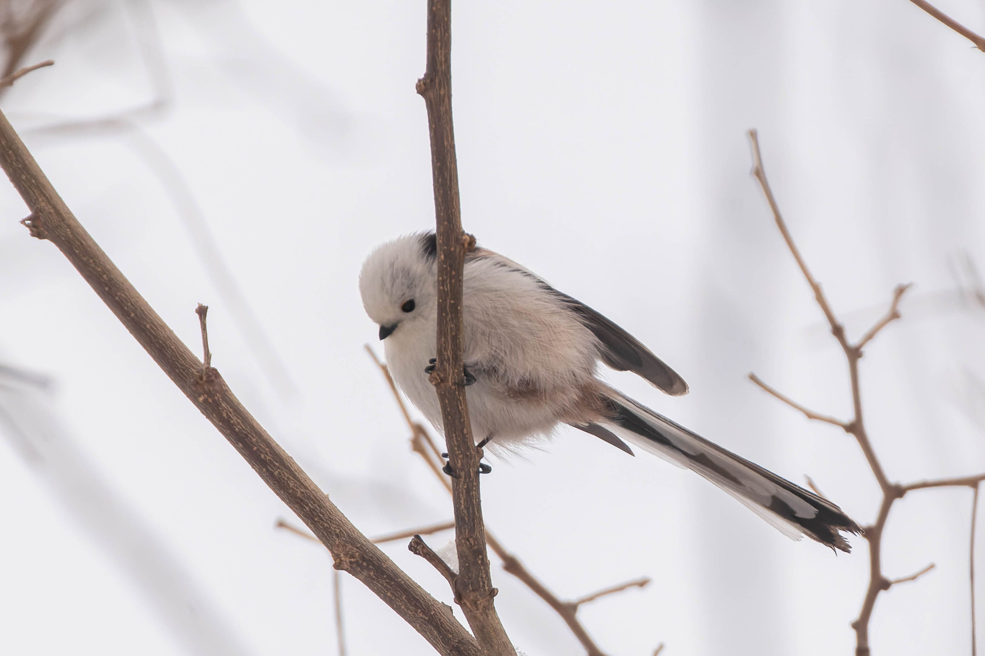 某所でクマゲラ撮る方々に混ざってクマゲラ待ってたんですけど カメラ持ってない身内に付き合っててもらったのが寒すぎて申し訳なくなったので一足お先に撤退したんですよね その瞬間クマゲラきてパシャっと抑えたんですけど その帰り道でチリチリ鳴いてたシマエナガの方です クマゲラはシャッターチャンス自体が貴重だから仕方ないんですけど目にピントが合わなくてですね…いや2回目ですけど…