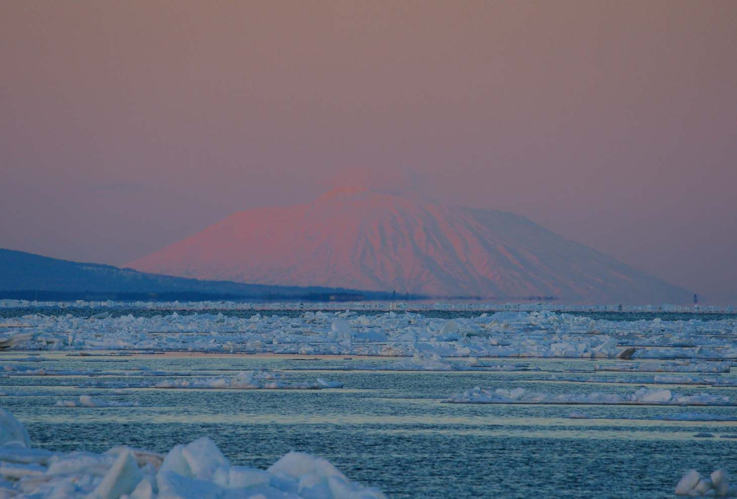 国後島の雪を纏った活火山の爺爺岳と流氷。爺爺岳は、まるでカムチャツカの火山のようです。