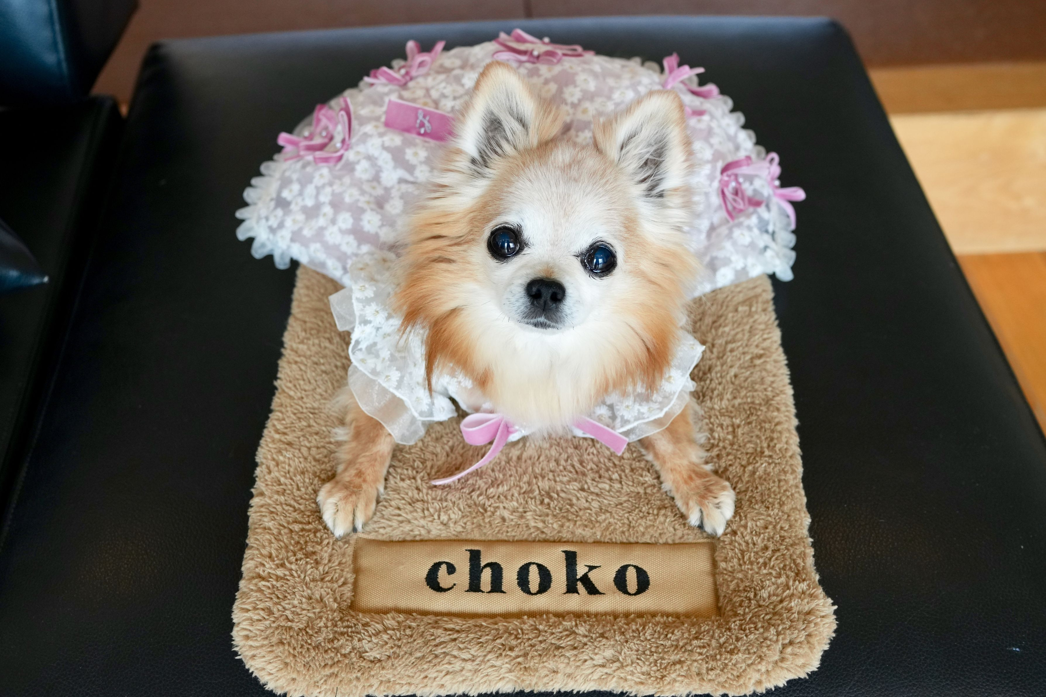 ちょこに名前入りのマットをプレゼントいただきました。言わずと自分のものであるとわかっているようです。 #ペット自慢2024_犬#