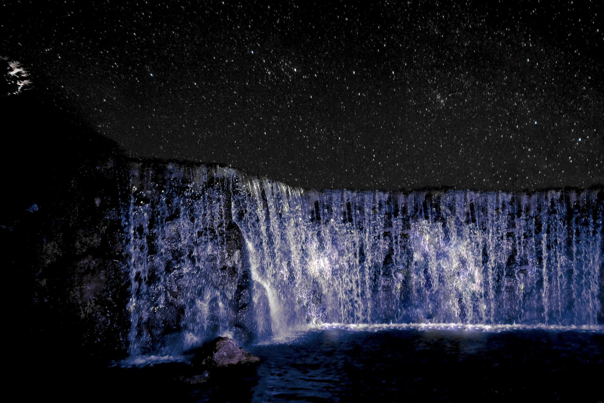 山間の闇夜に滝しぶきの音だけが響く ledライトを照らしてみた