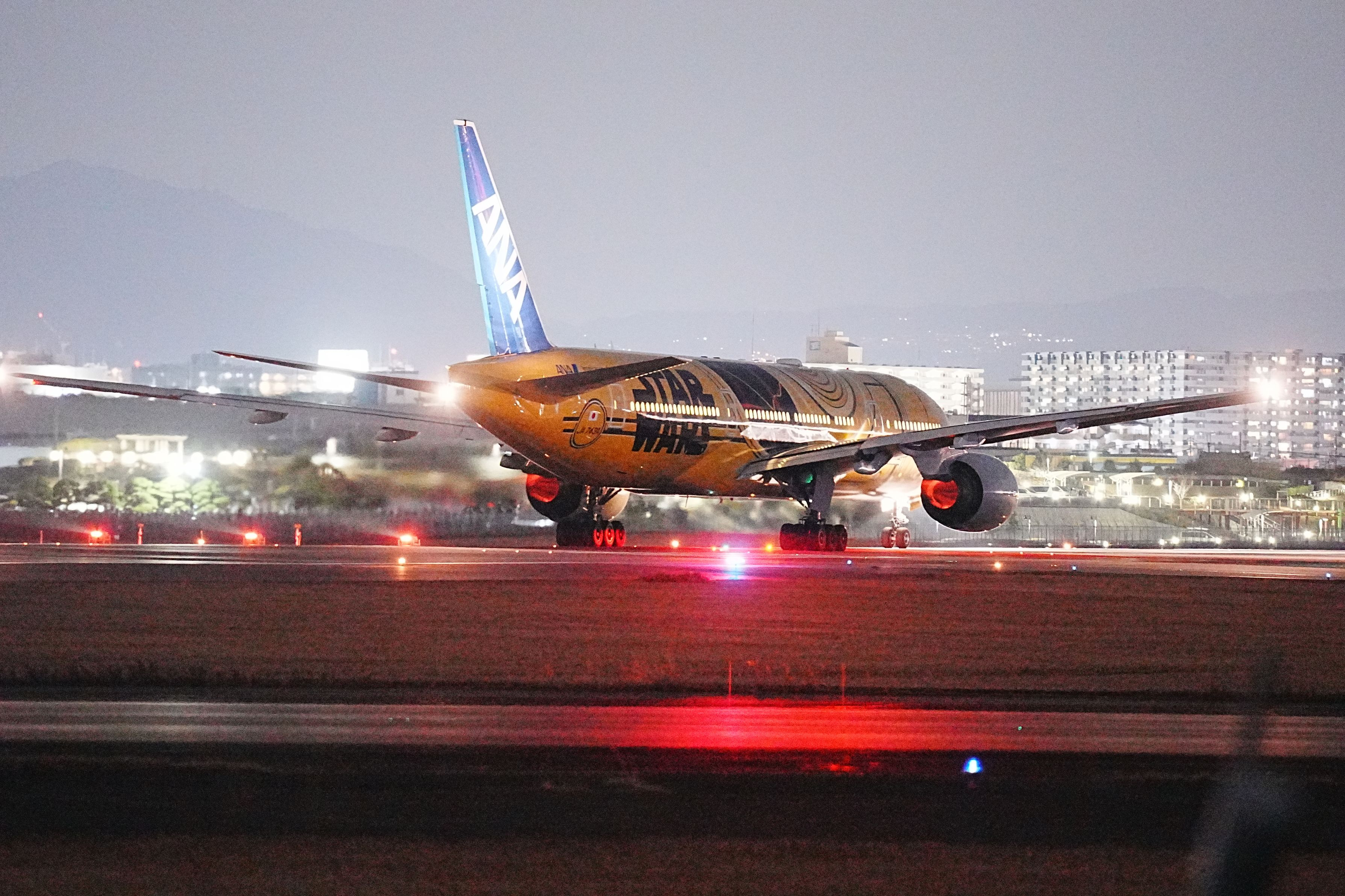 2024年03月01日(金曜日) 20:36 天気:晴れ 伊丹空港 千里川土手 NA B777-281( ER ) ( JA743A ) 「 Star Wars C-3PO」特別塗装機 NH40便 伊丹空港 ⇒ 羽田空港